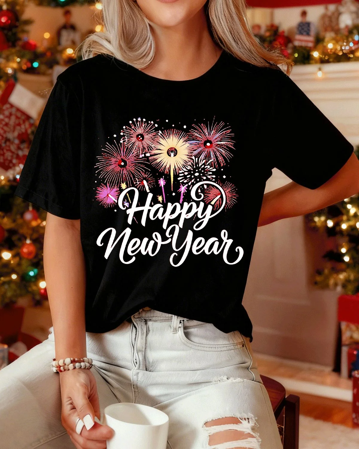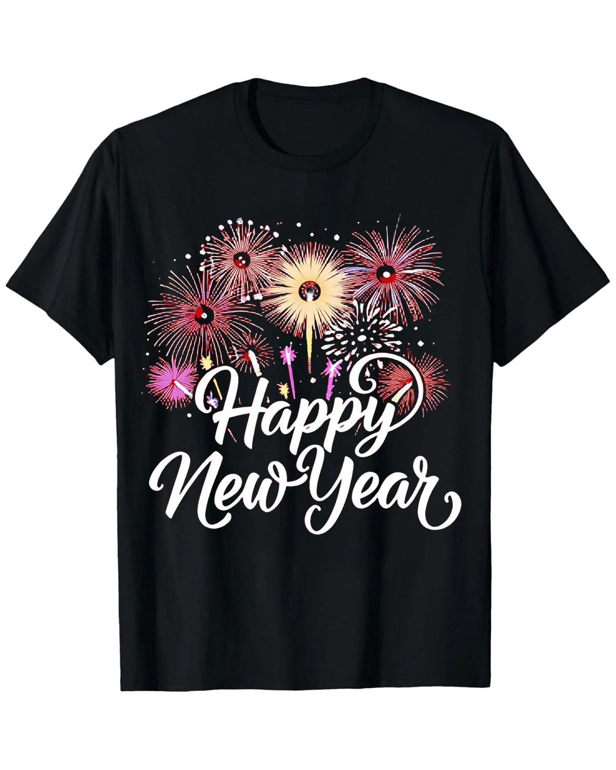 Happy New Year Fireworks Celebration Summer Cotton Graphic T Shirt - Casual Vintage, Short Sleeve, Soft Fabric, Comfortable Fit