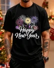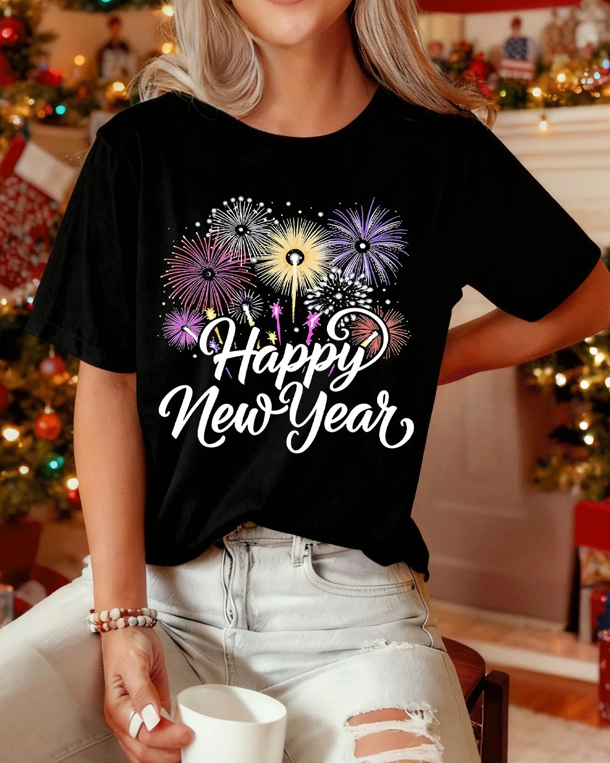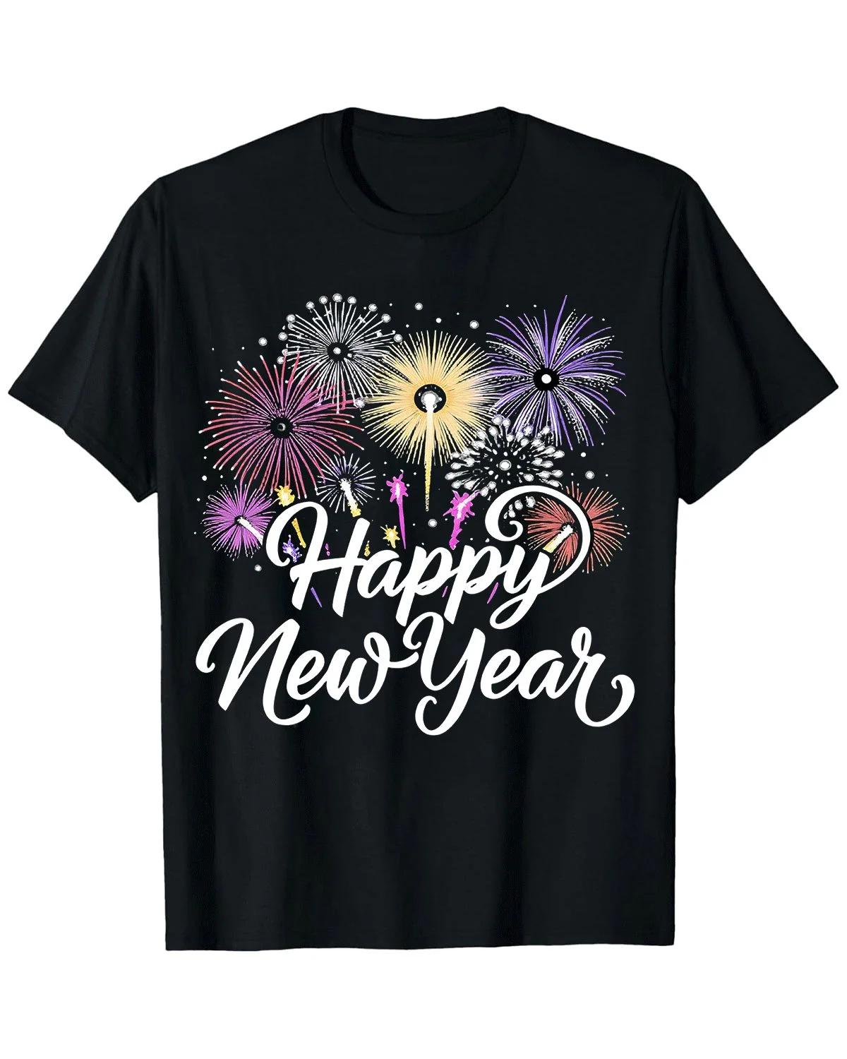 Happy New Year Fireworks Celebration Summer Cotton Graphic T Shirt - Casual Vintage, Short Sleeve, Soft Fabric, Comfortable Fit