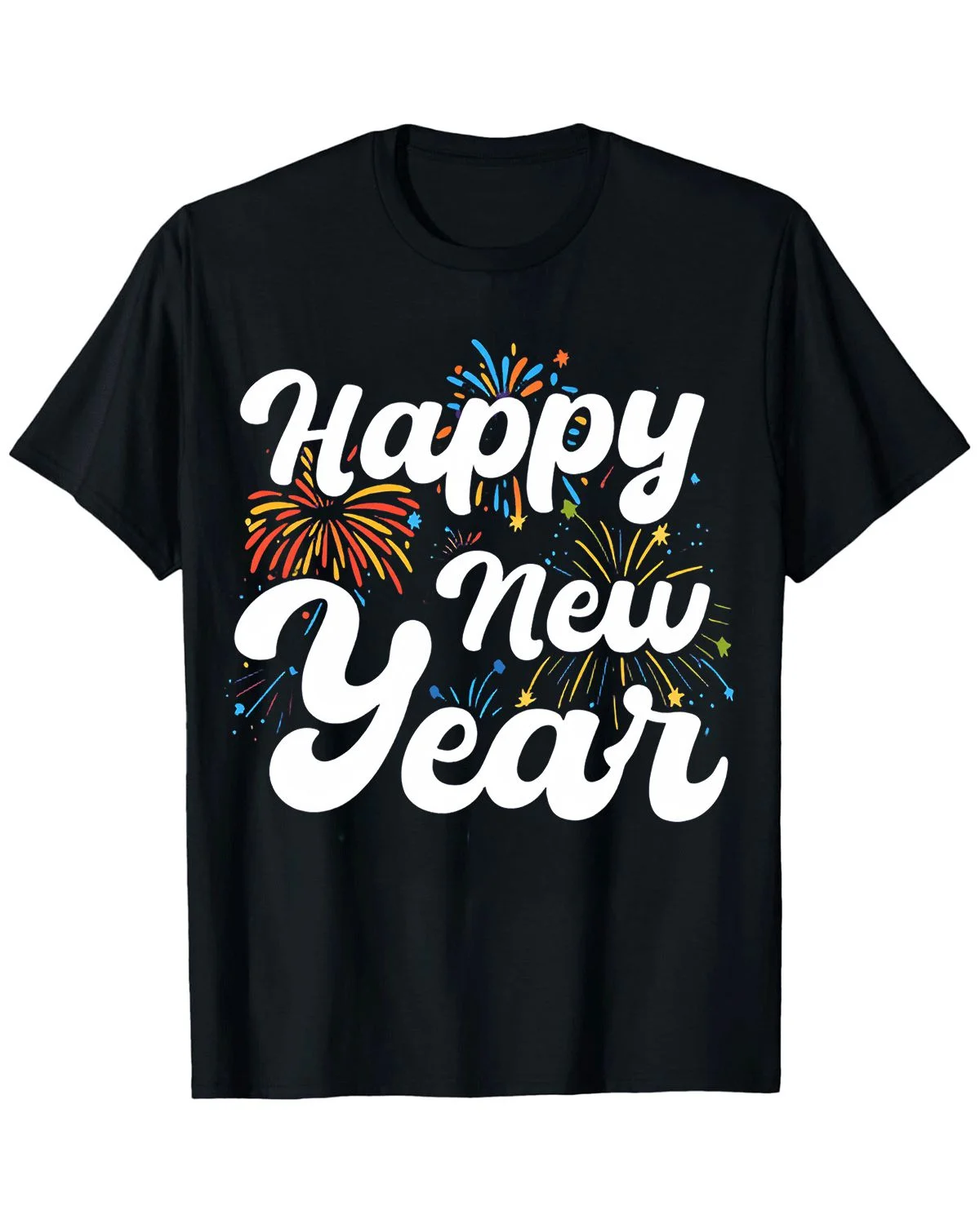 Happy New Year Fireworks Summer Cotton Graphic T Shirt - Casual Vintage, Short Sleeve, Soft Fabric, Comfortable Fit