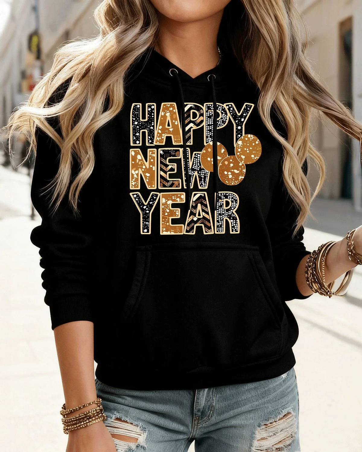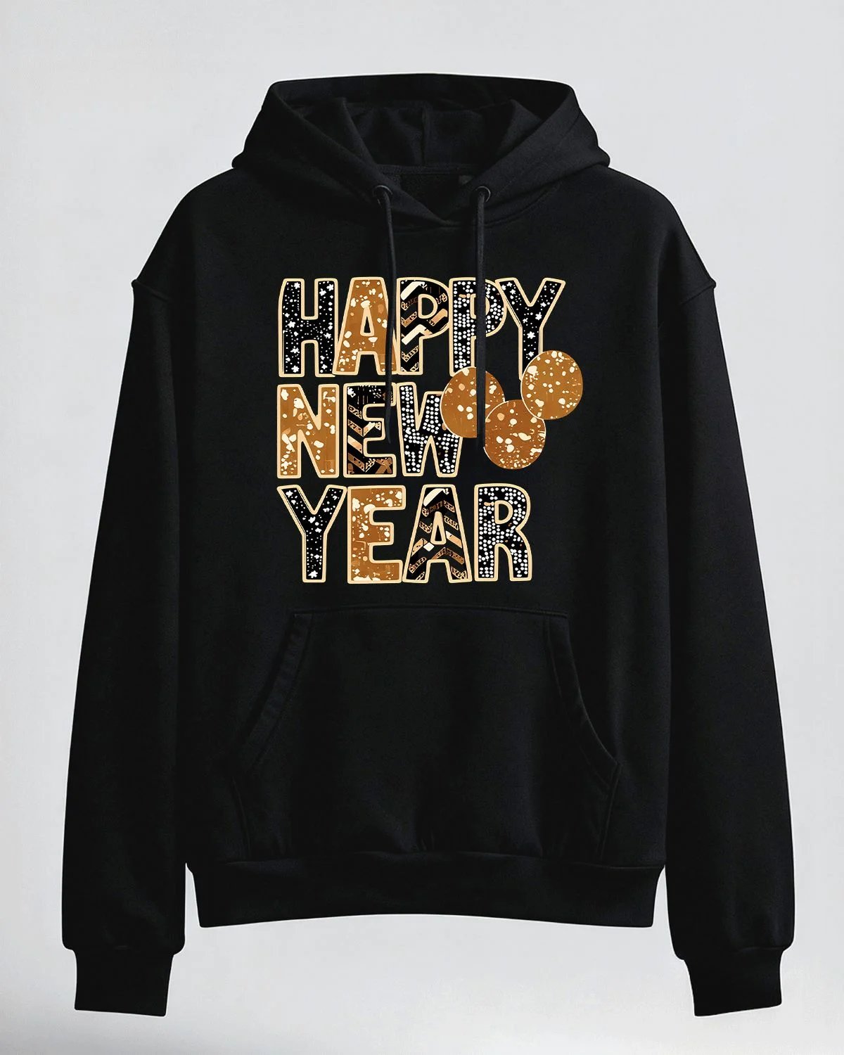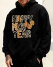 Happy New Year Gold and Black Lettering Cozy Graphic Hoodie for Men and Women - Casual Vintage, Long Sleeve, Soft Fabric, Comfortable Fit