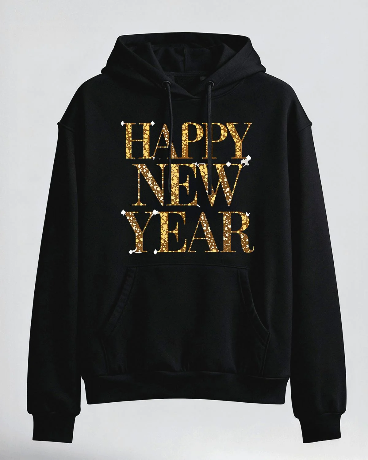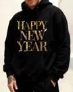 Happy New Year Gold Glitter Lettering Cozy Graphic Hoodie for Men and Women - Classic Vintage, Long Sleeve, Soft Fabric, Comfortable Fit