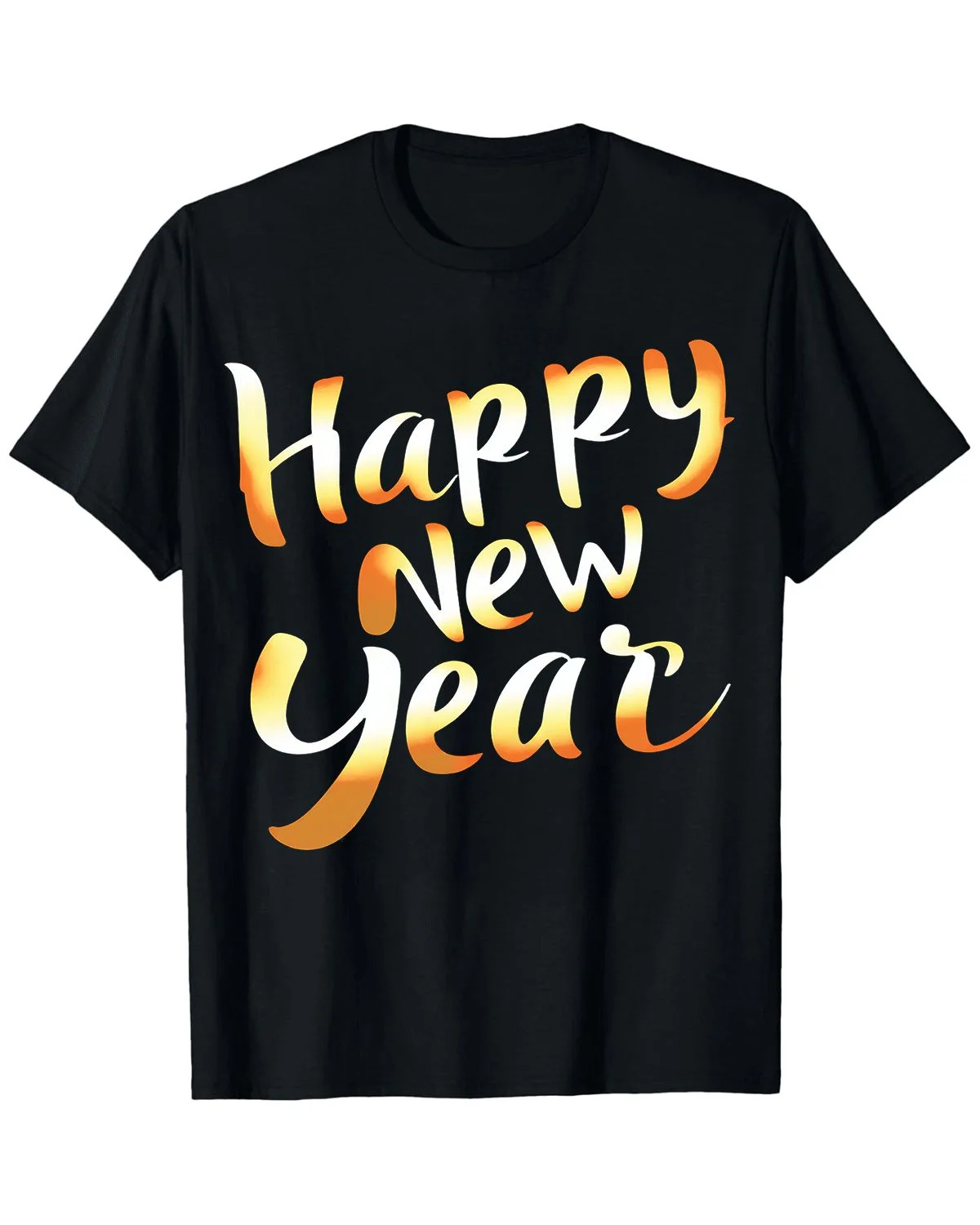 Happy New Year Gold Gradient Script Summer Cotton Graphic T Shirt - Casual Modern, Short Sleeve, Soft Fabric, Comfortable Fit