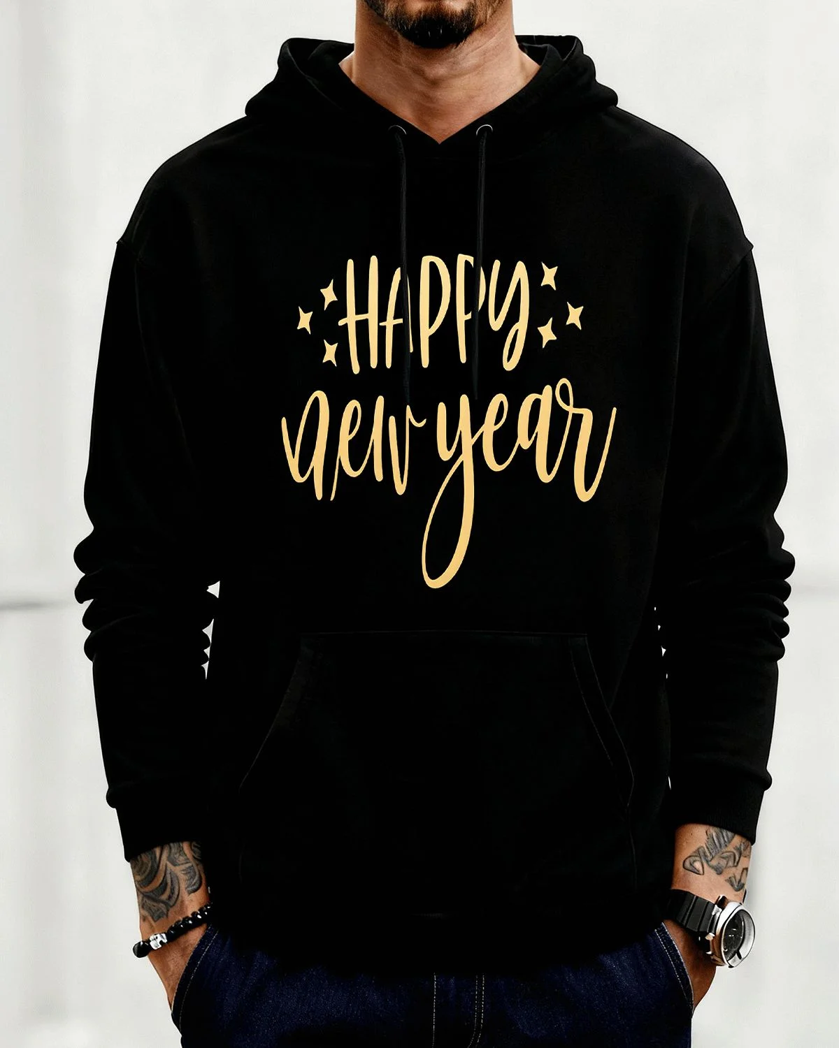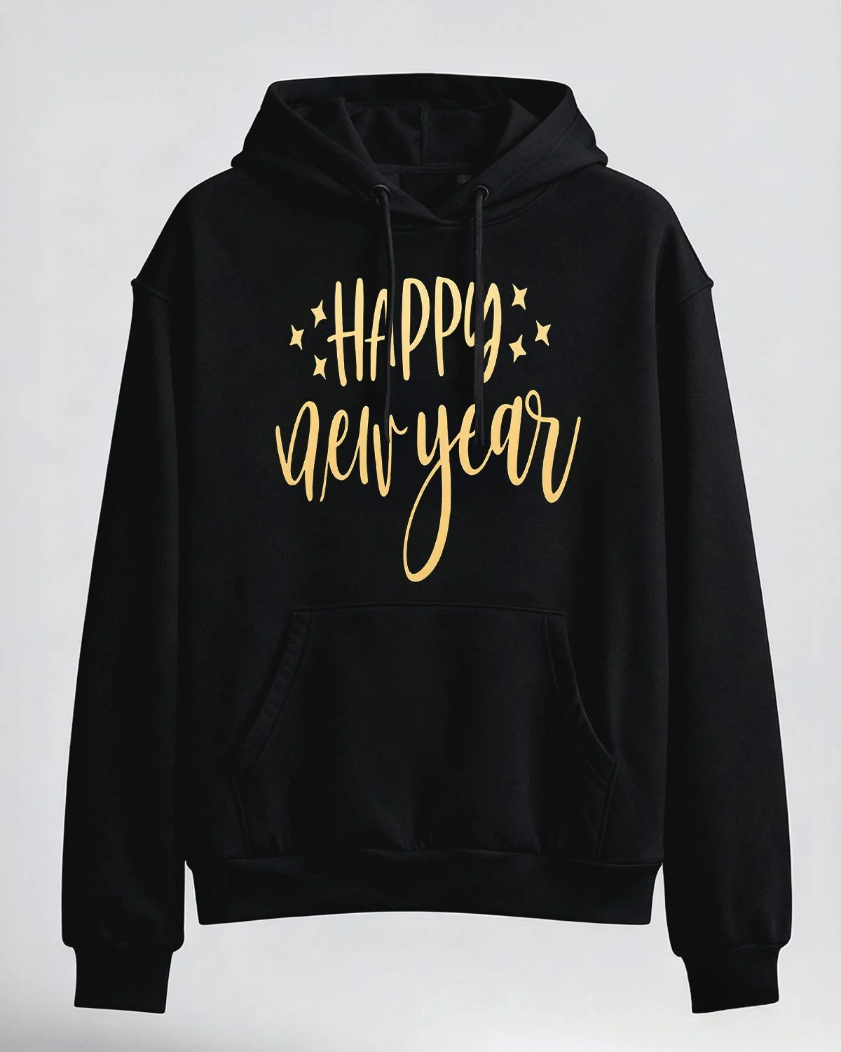 Happy New Year Gold Lettering with Stars Cozy Graphic Hoodie for Men and Women - Casual Chic, Long Sleeve, Soft Fabric, Comfortable Fit