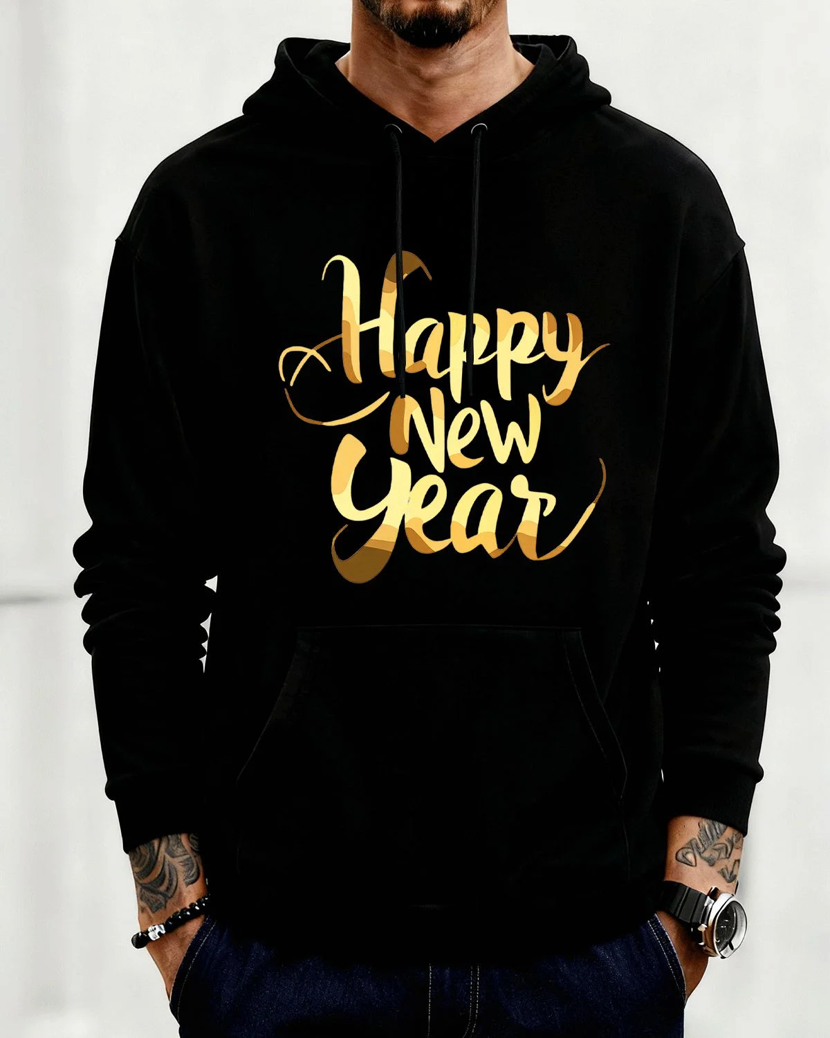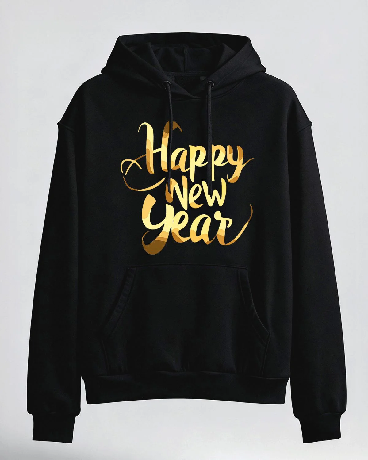 Happy New Year Golden Script Cozy Graphic Hoodie for Men and Women - Classic Vintage, Long Sleeve, Soft Fabric, Comfortable Fit