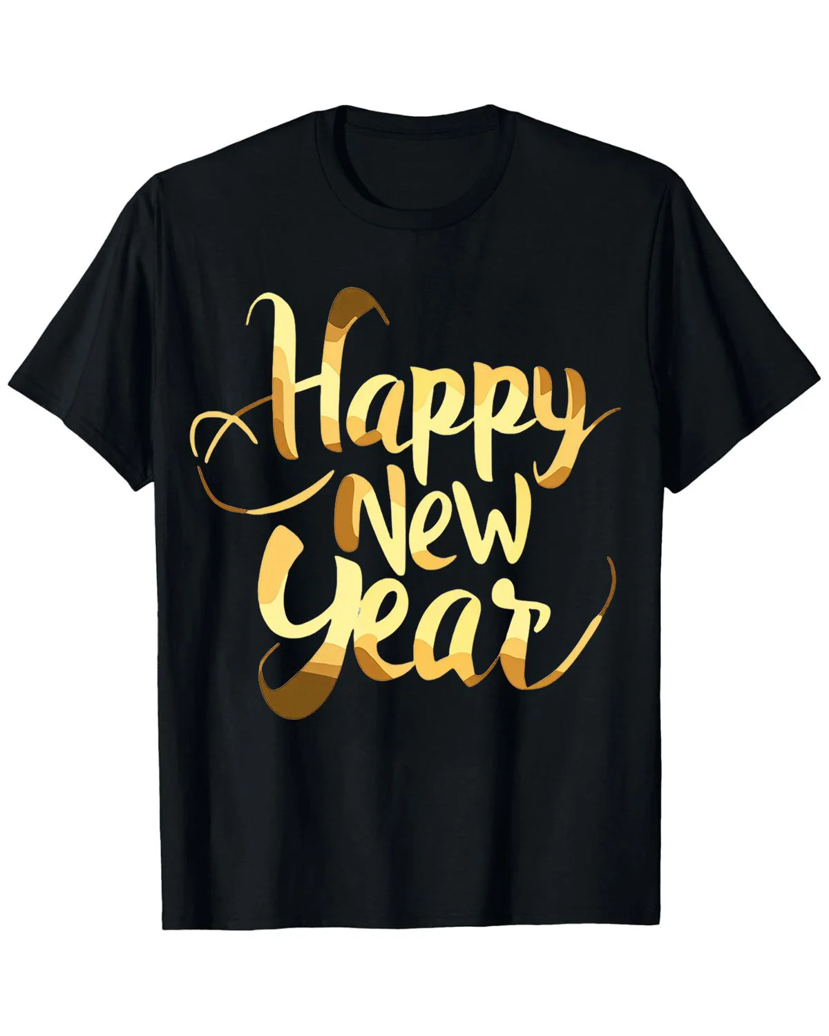 Happy New Year Golden Script Summer Cotton Graphic T Shirt - Classic Vintage, Short Sleeve, Soft Fabric, Comfortable Fit
