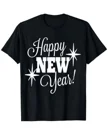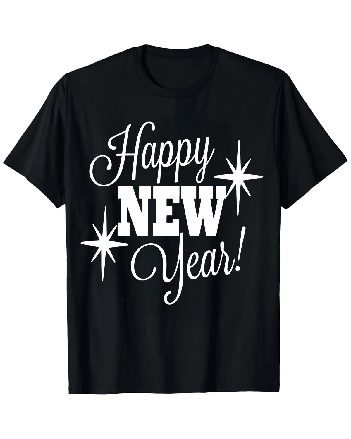Happy New Year Greeting with Stars Summer Cotton Graphic T Shirt - Casual Vintage, Short Sleeve, Soft Fabric, Comfortable Fit