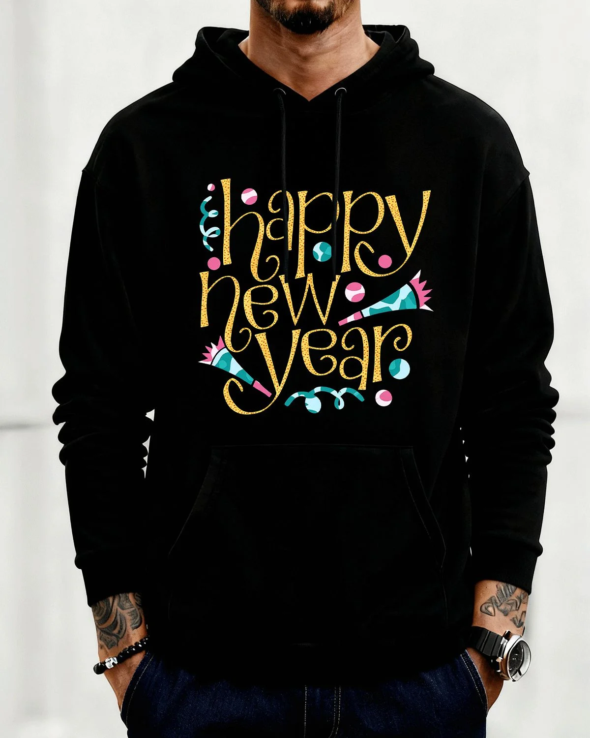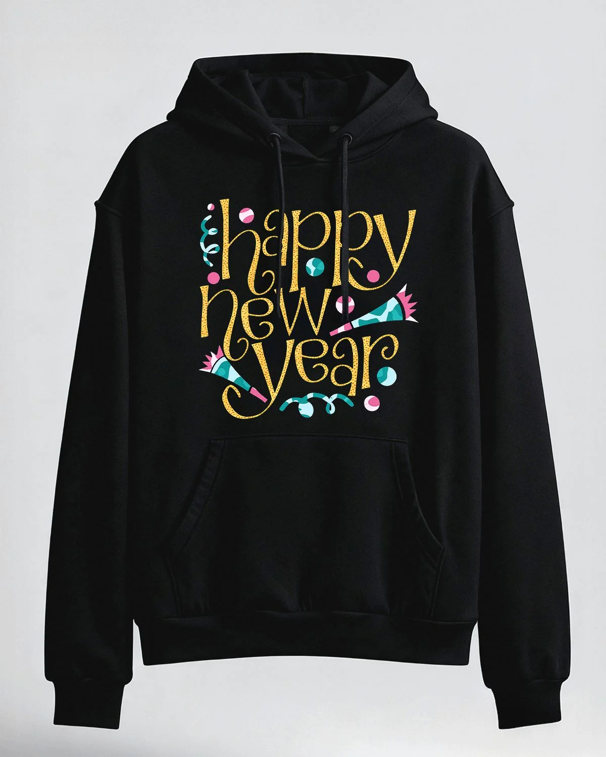 Happy New Year Party Horns and Confetti Cozy Graphic Hoodie for Men and Women - Casual Artistic, Long Sleeve, Soft Fabric, Comfortable Fit