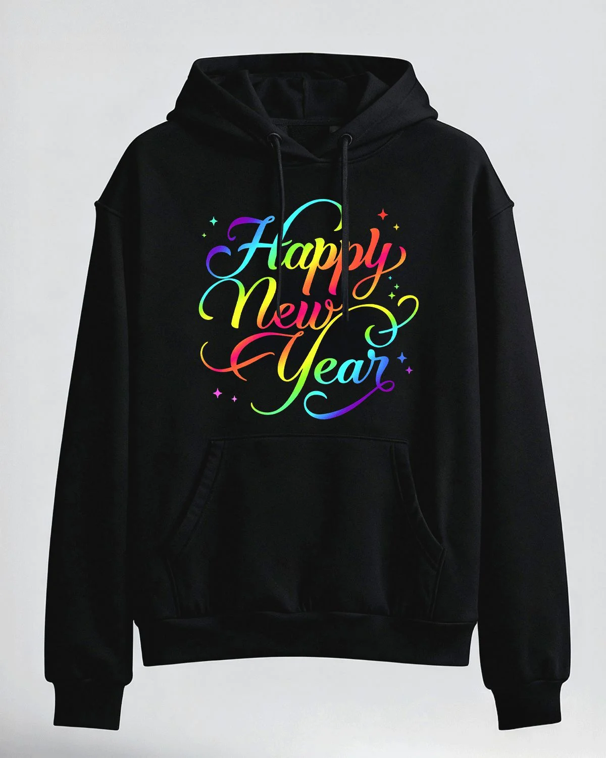 Happy New Year Rainbow Lettering Cozy Graphic Hoodie for Men and Women - Artistic Modern, Long Sleeve, Soft Fabric, Comfortable Fit