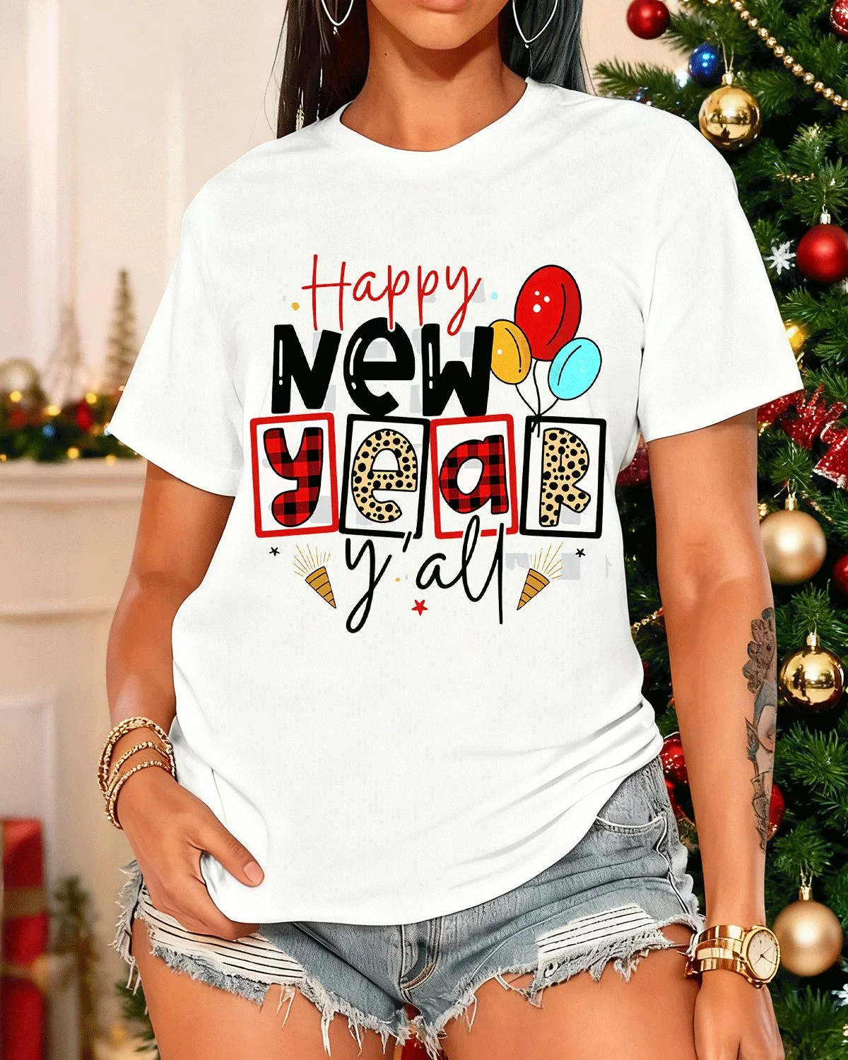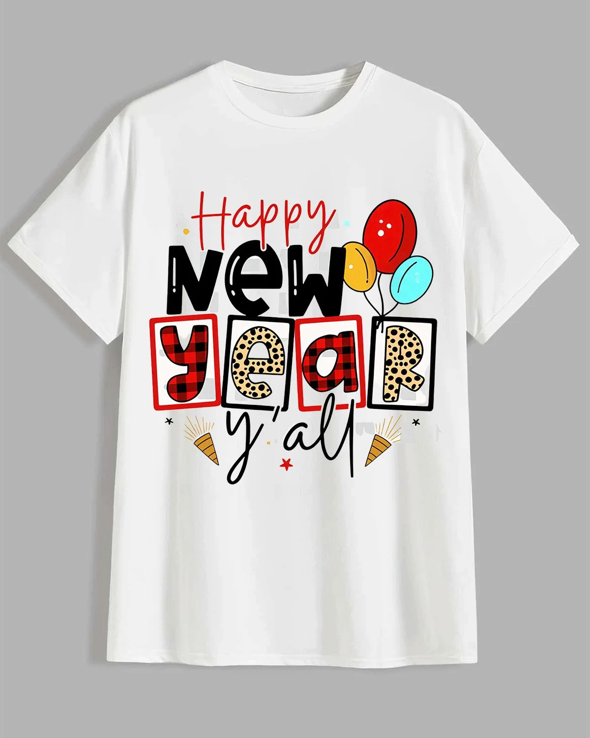 Happy New Year Y'all Balloons and Confetti Summer Cotton Graphic T Shirt - Casual Vintage, Short Sleeve, Soft Fabric, Comfortable Fit