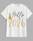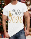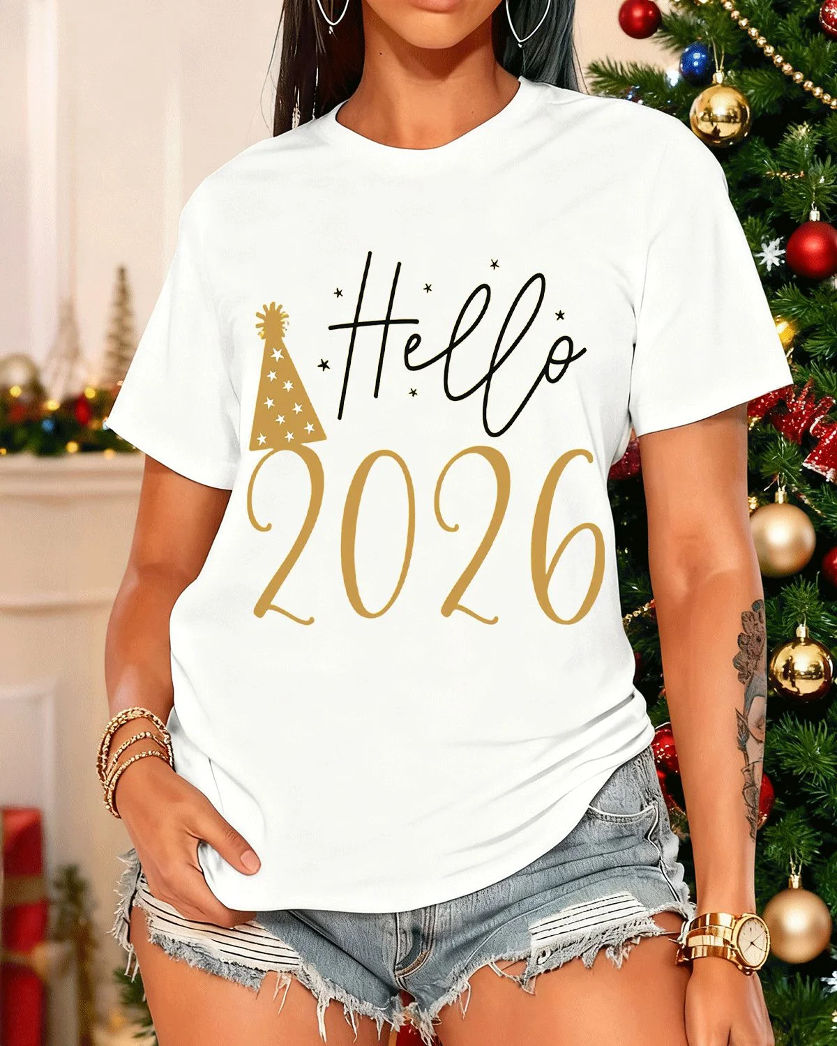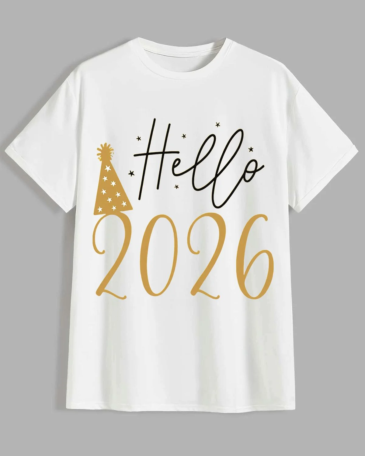 Hello 2026 New Year Party Hat and Stars Summer Cotton Graphic T Shirt - Casual Modern, Short Sleeve, Soft Fabric, Comfortable Fit