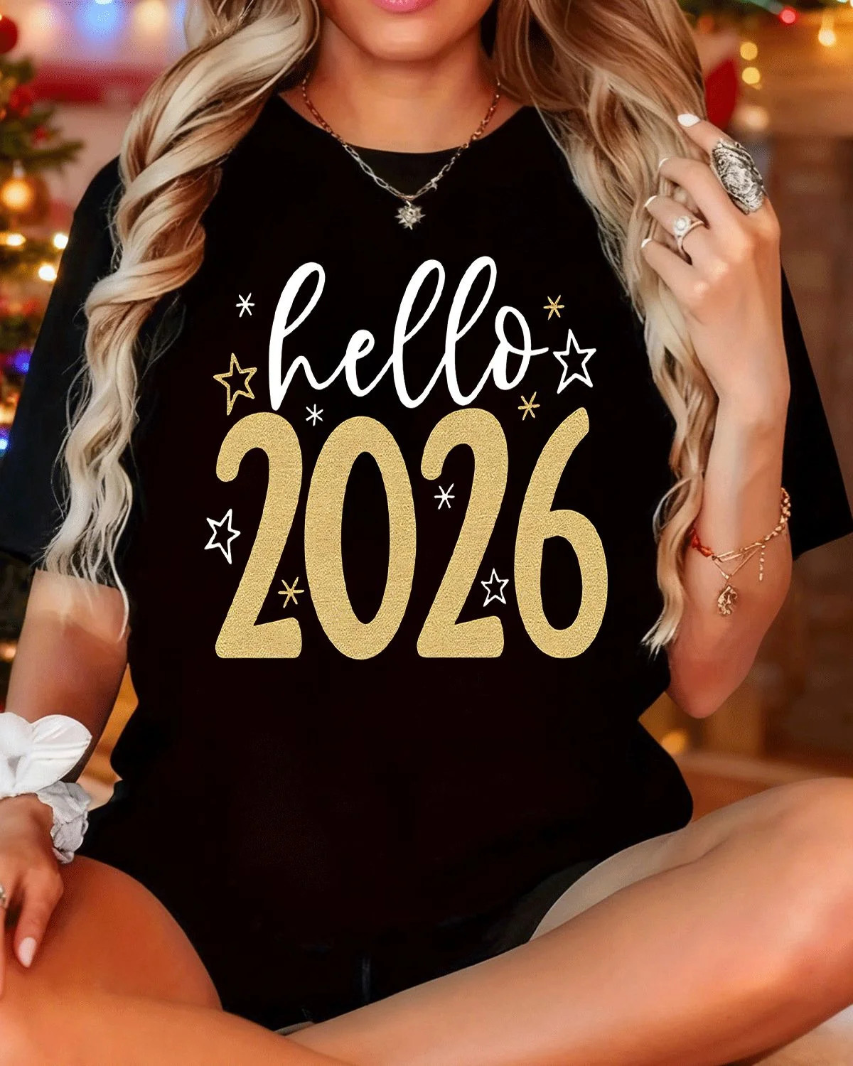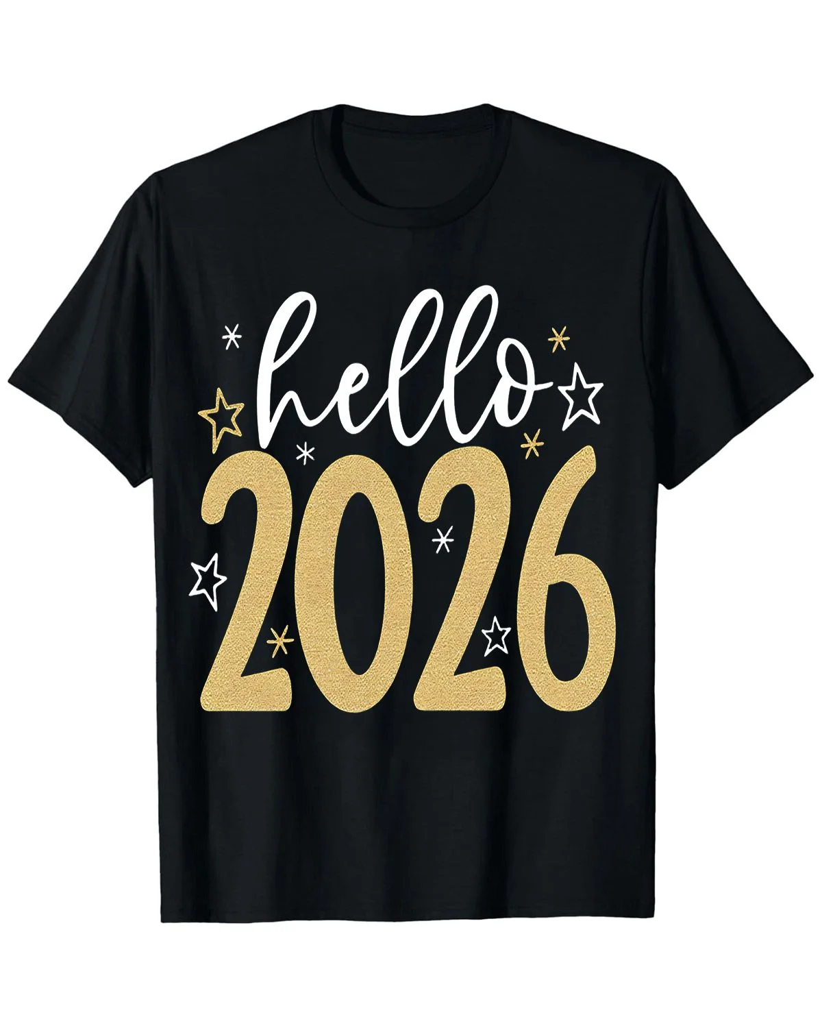 Hello 2026 New Year Stars Summer Cotton Graphic T Shirt - Casual Modern, Short Sleeve, Soft Fabric, Comfortable Fit
