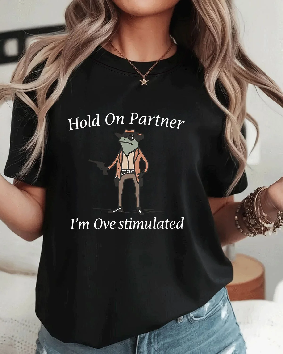 Hold On Partner Frog Cowboy Summer Cotton Graphic T Shirt - Funny Retro,Short Sleeve,Soft Fabric,Comfortable Fit