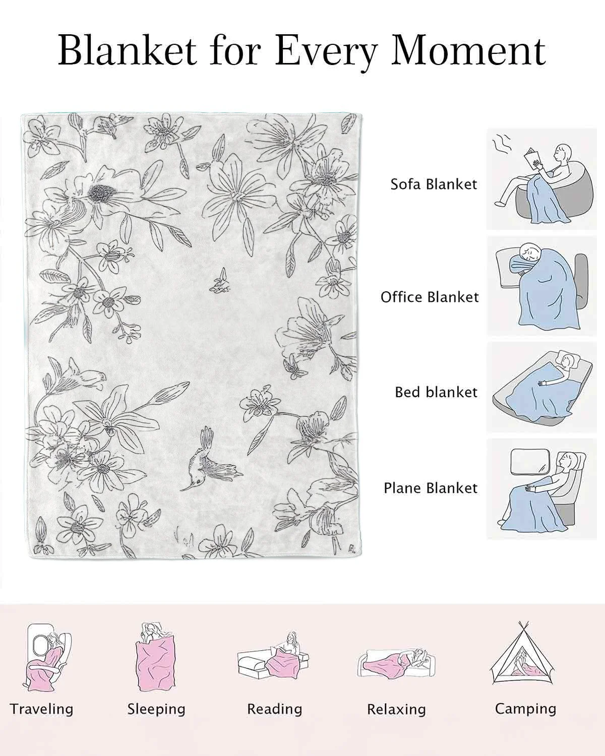 Hummingbird and Floral Love Gift Cozy Flannel Blanket-Elegant Classic,Super Soft,Warm,Lightweight,For Bed,Home Decor