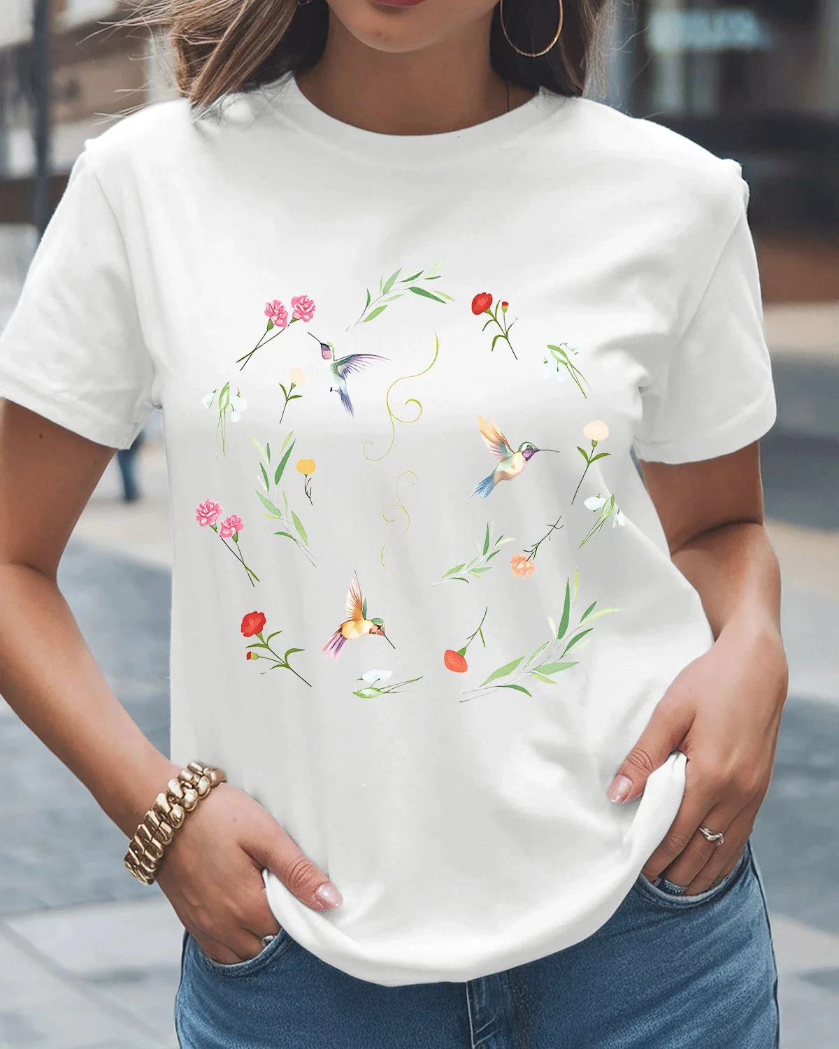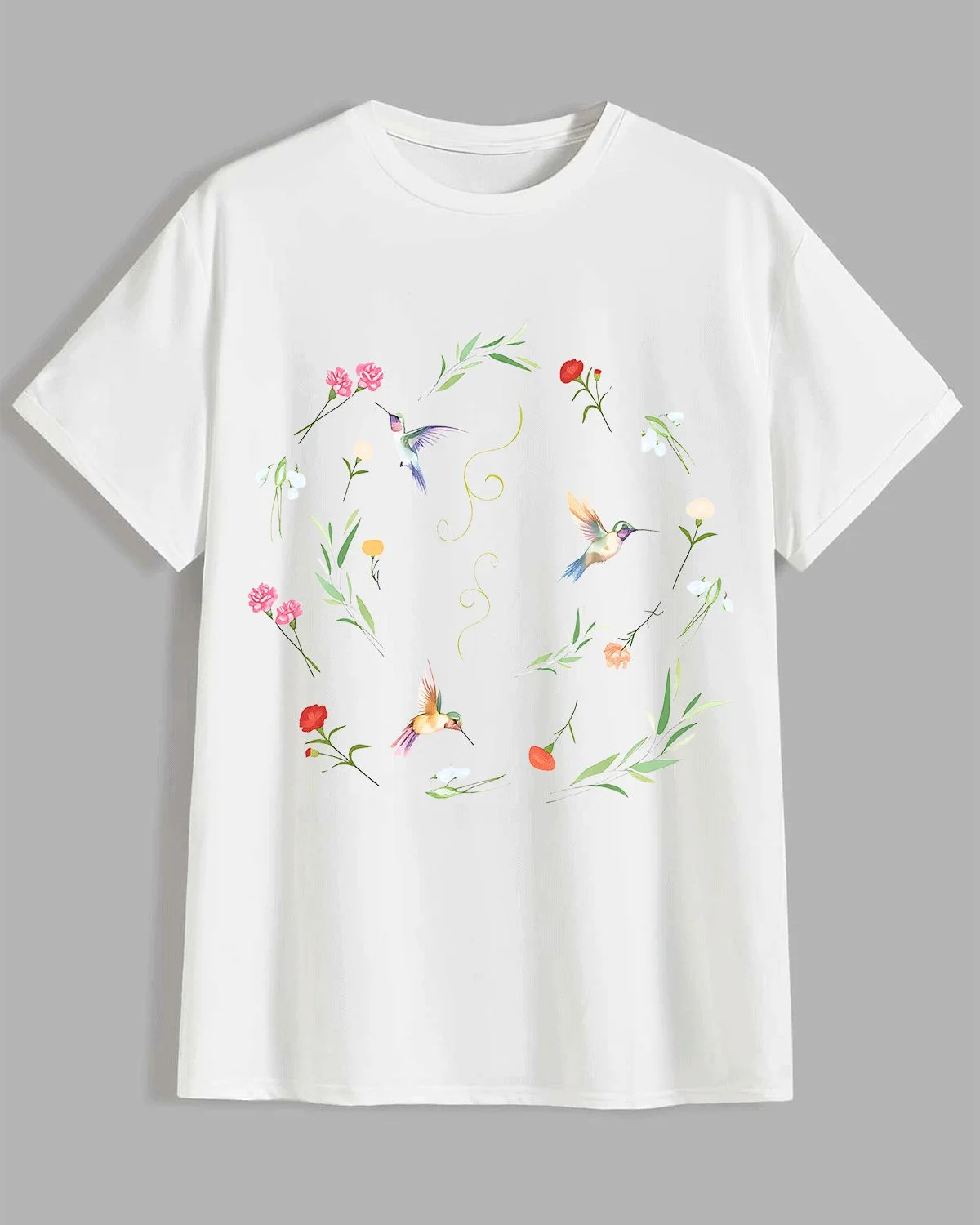 Hummingbirds and Wildflowers Summer Cotton Graphic T Shirt - Artistic Vintage,Short Sleeve,Soft Fabric,Comfortable Fit