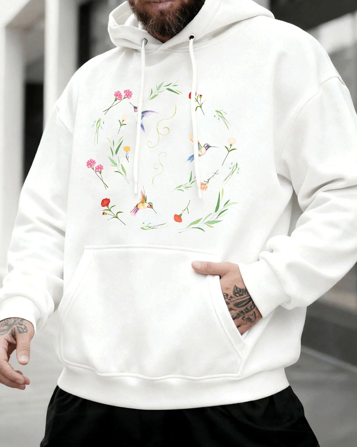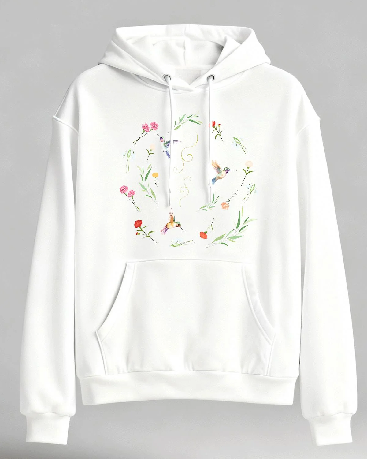 Hummingbirds and Wildflowers Summer Cozy Graphic Hoodie - Artistic Vintage, Long Sleeve, Soft Fabric, Comfortable Fit