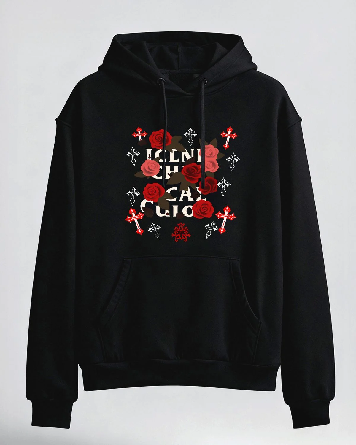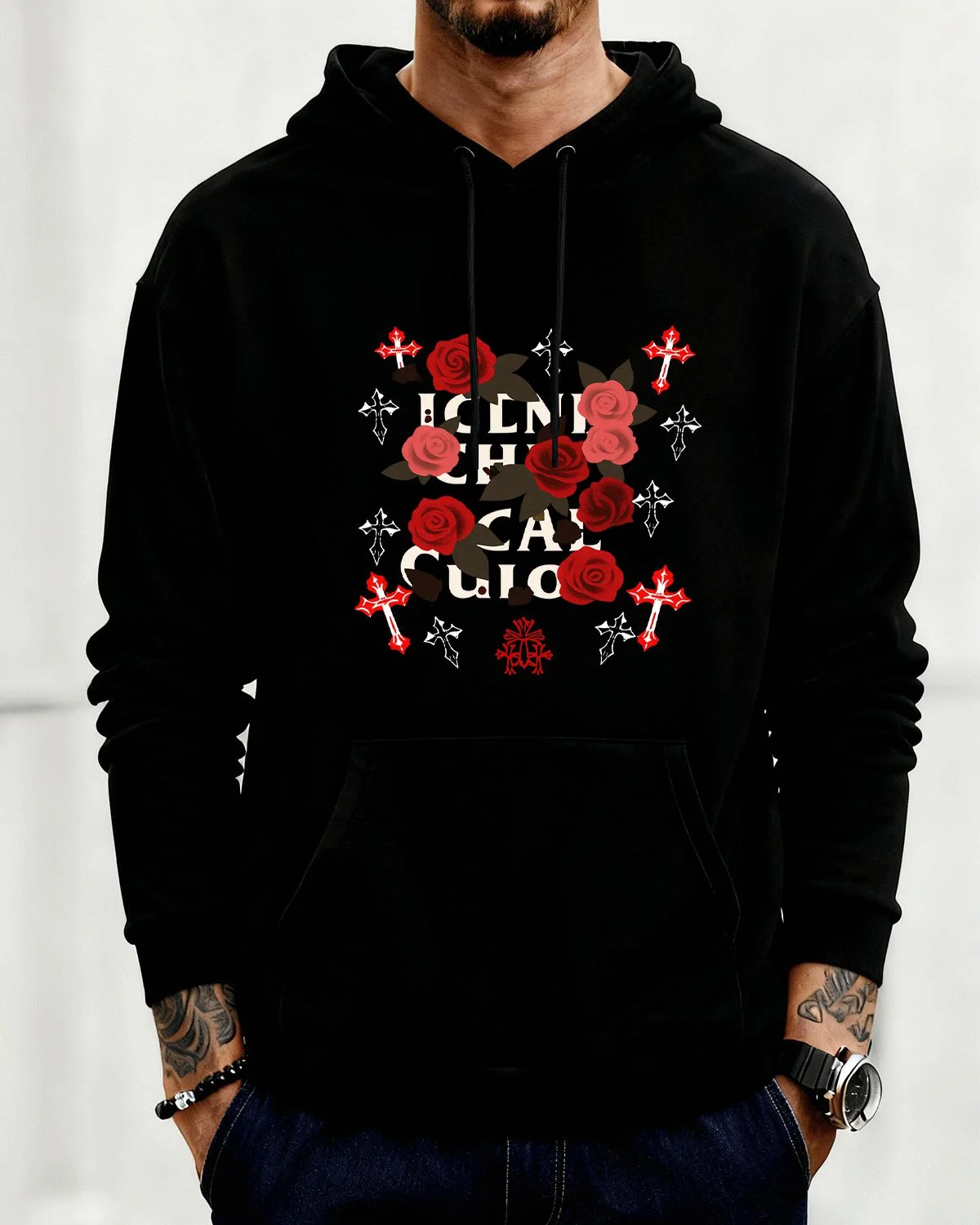 Iconic Chaos Roses and Crosses Cozy Cotton Graphic Hoodie with Pocket-Vintage Artistic,Long Sleeve,Soft Fabric,Comfortable Fit
