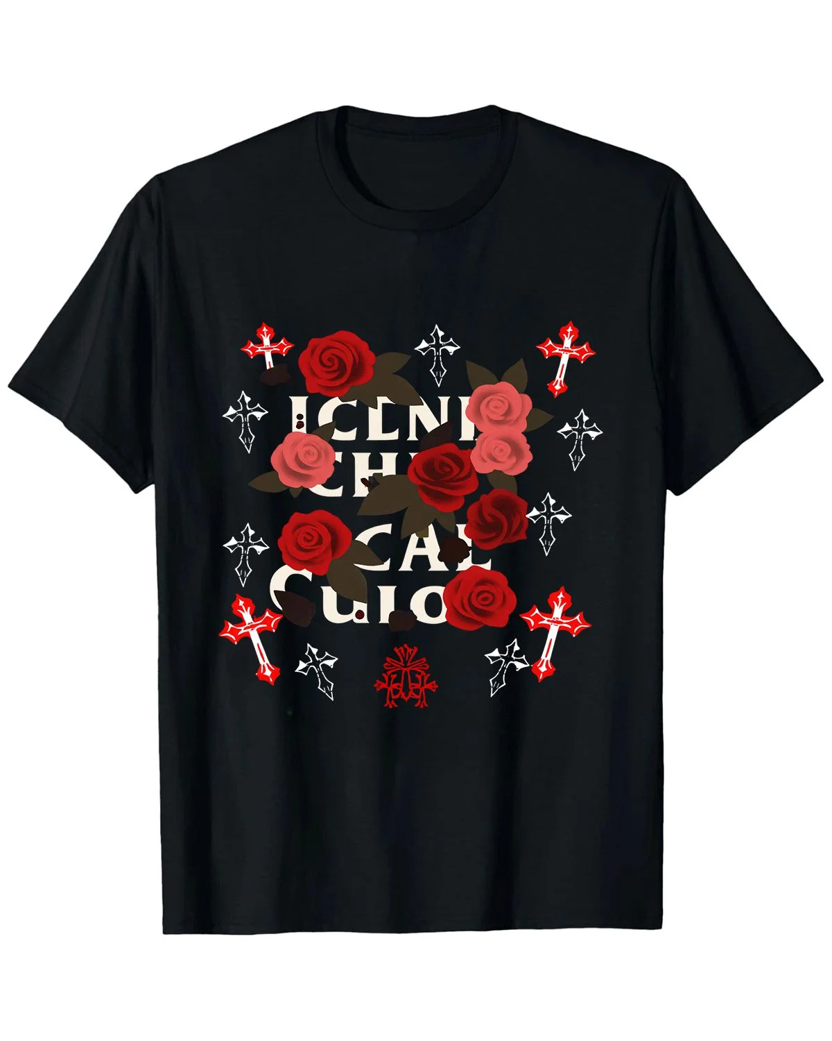 Iconic Chaos Roses and Crosses Summer Cotton Graphic T Shirt - Vintage Artistic,Short Sleeve,Soft Fabric,Comfortable Fit