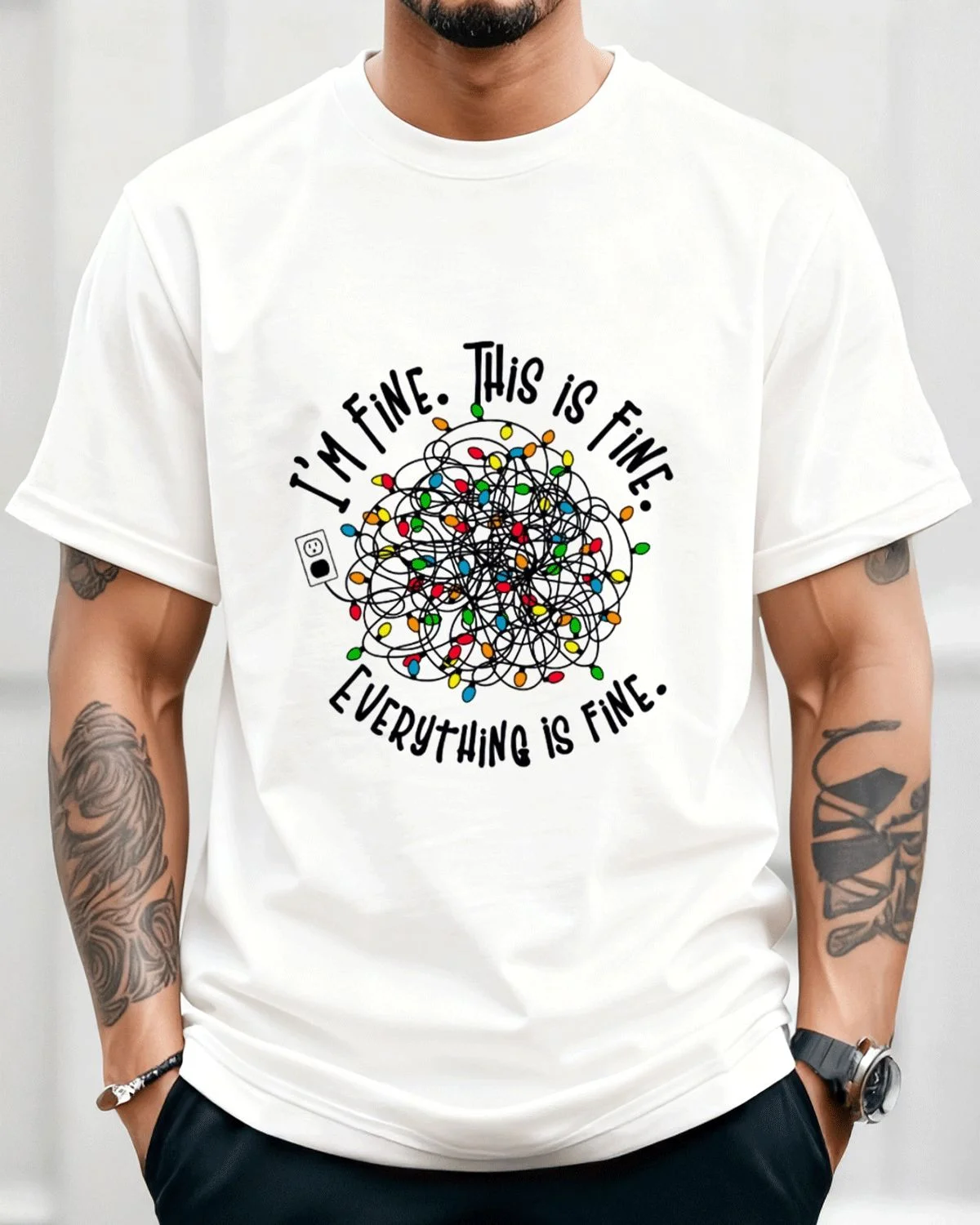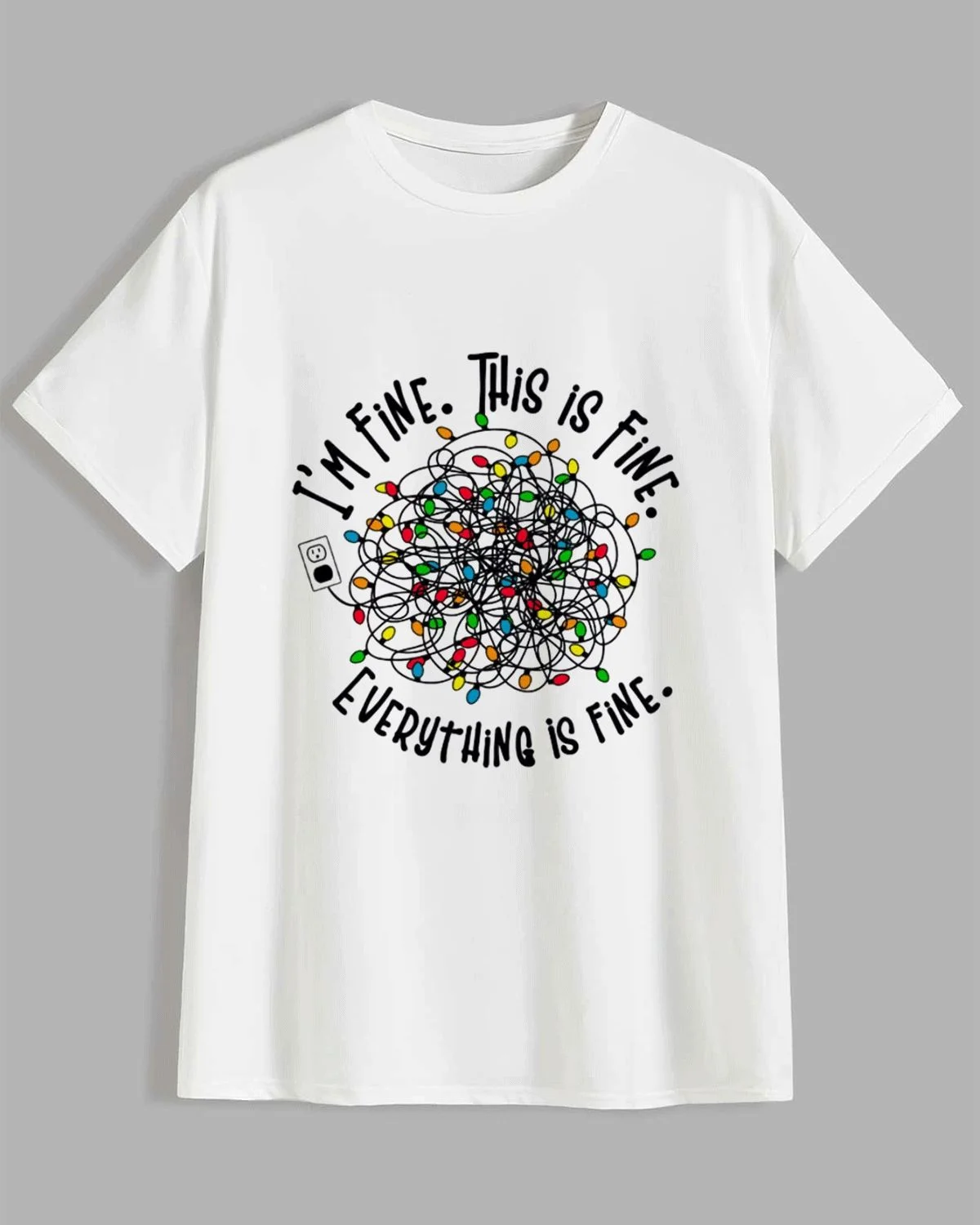 I'm Fine Tangled Christmas Lights Summer Cotton Graphic T Shirt - Casual Funny,Short Sleeve,Soft Fabric,Comfortable Fit