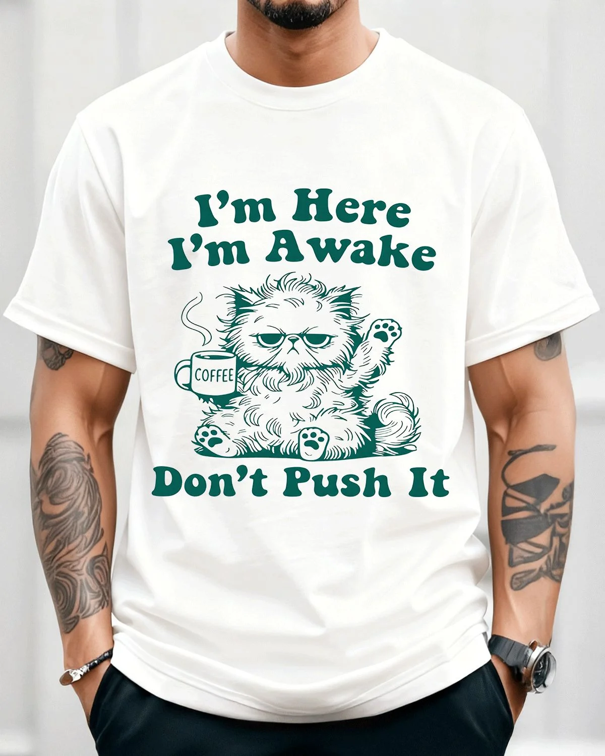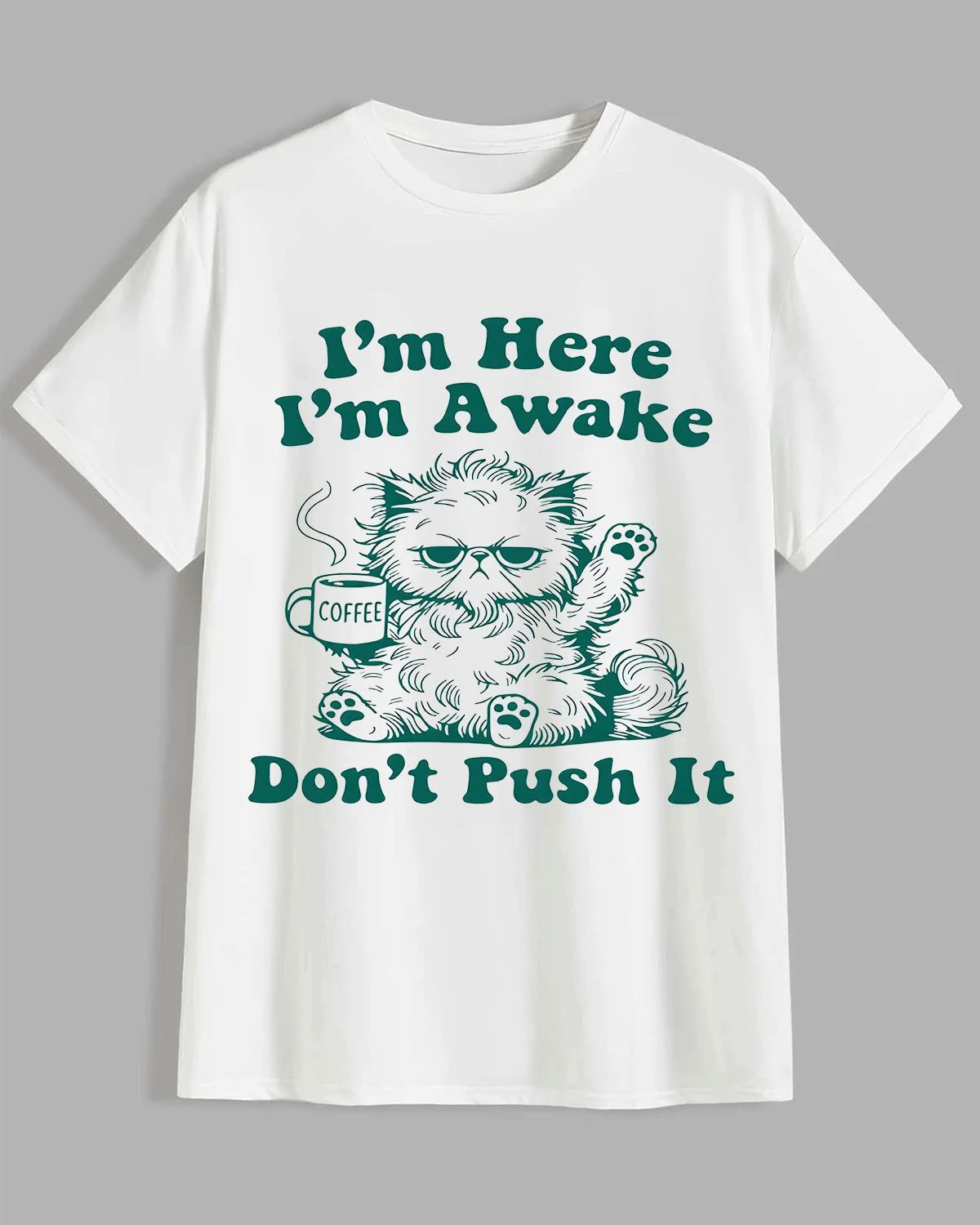 I'm Here I'm Awake Don't Push It Coffee Cat Summer Cotton Graphic T Shirt - Casual Funny, Short Sleeve, Soft Fabric, Comfortable Fit