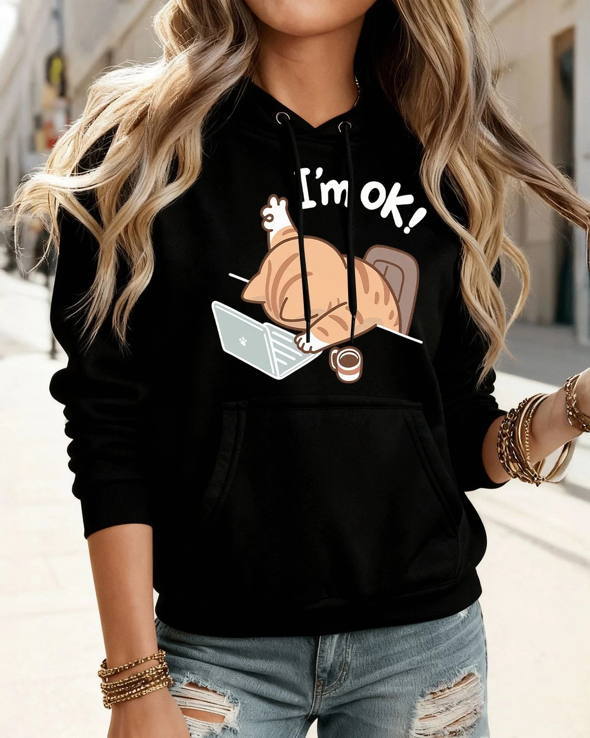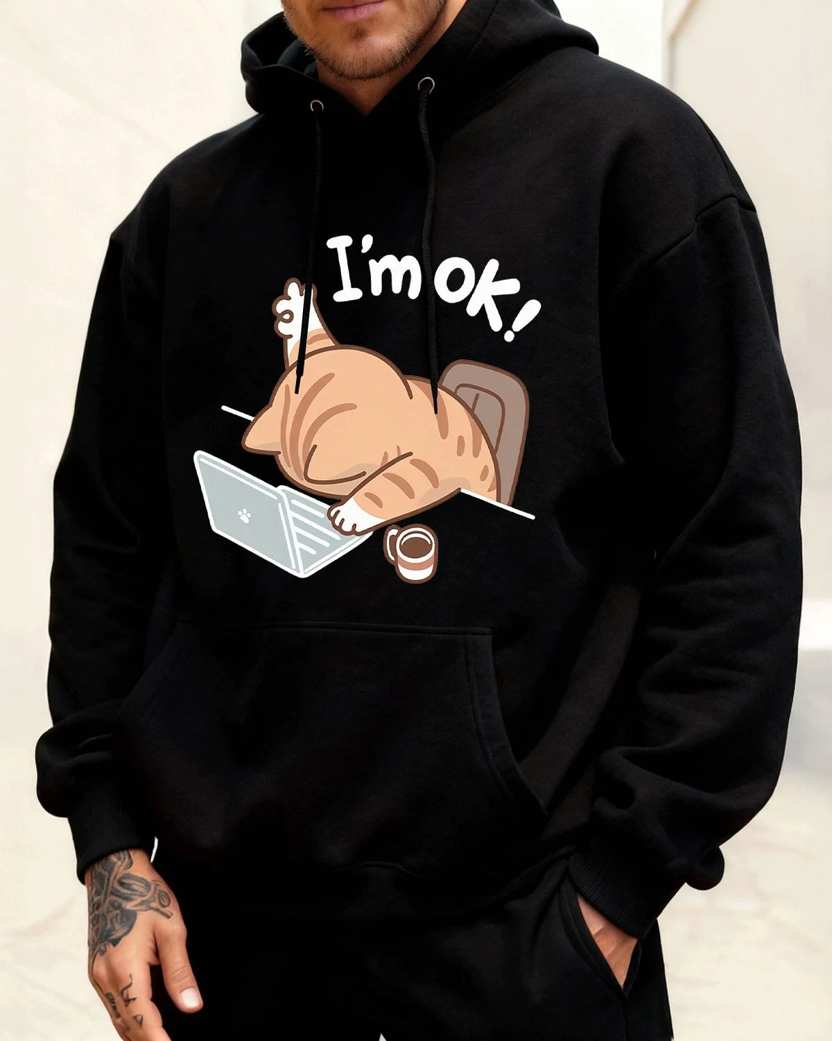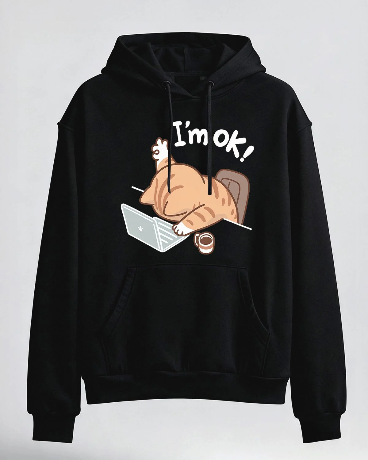I'm OK Cute Cat at Laptop Cozy Graphic Hoodie for Men and Women - Casual Funny, Long Sleeve, Soft Fabric, Comfortable Fit