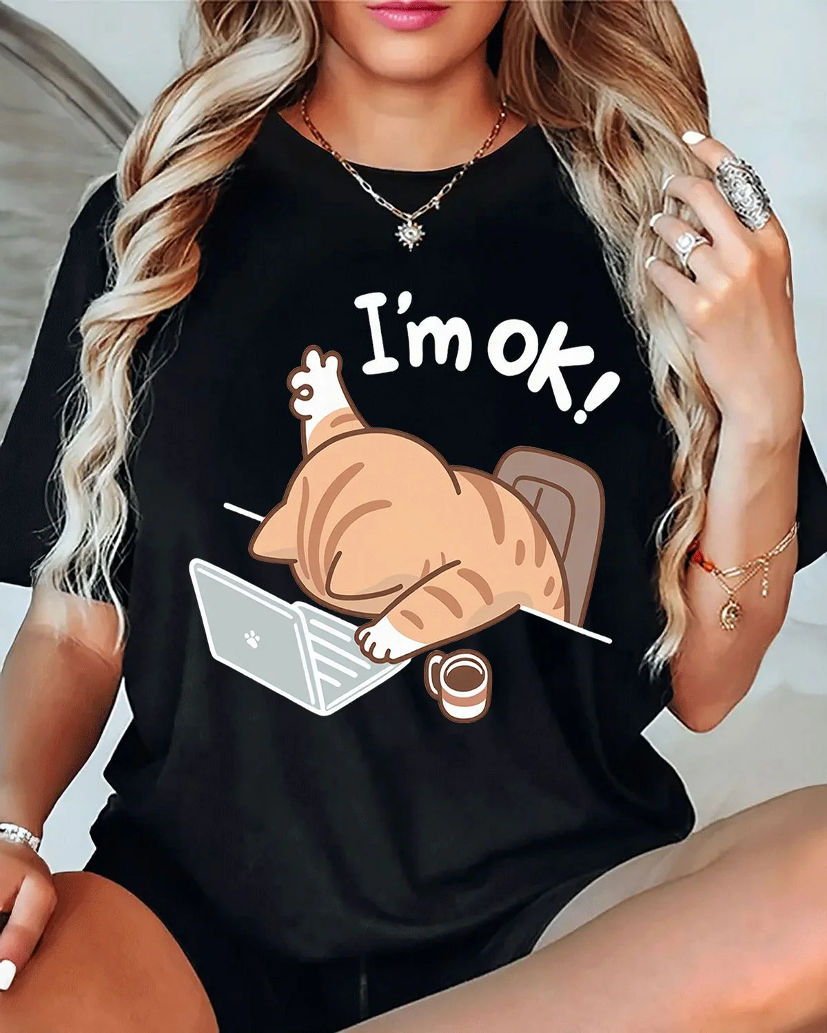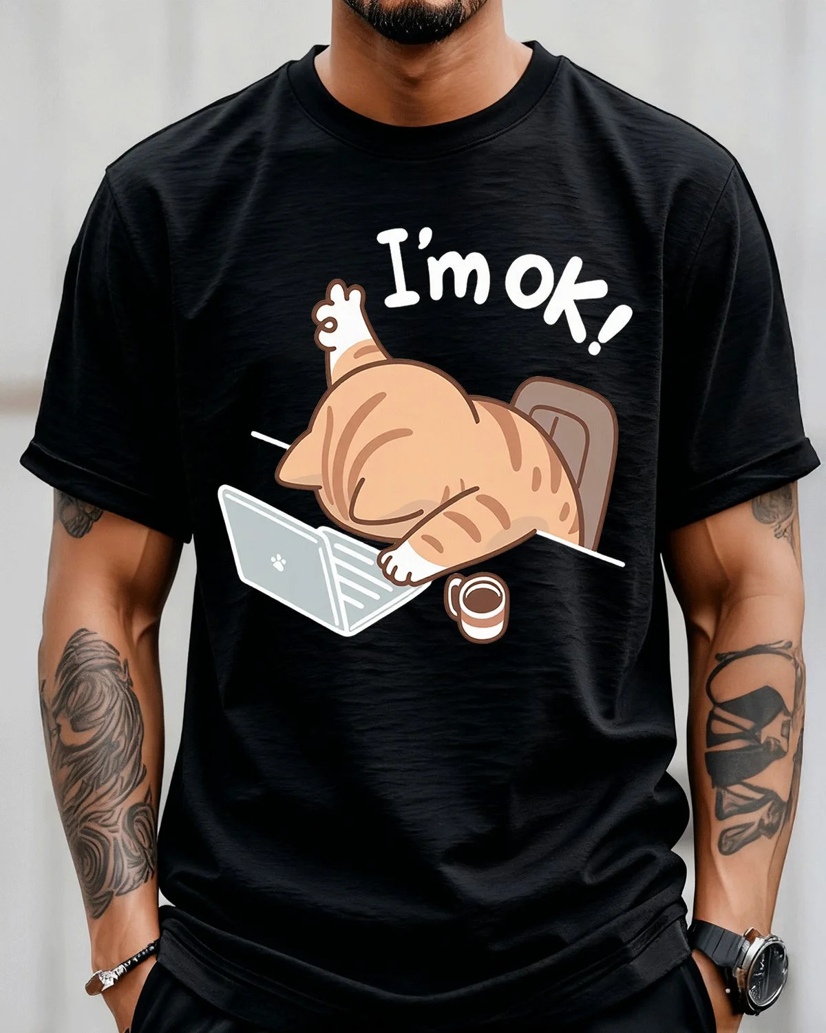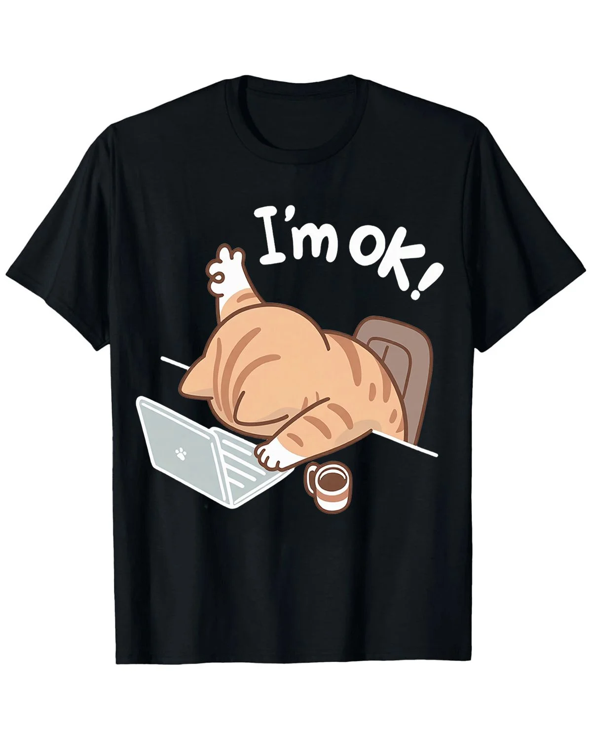 I'm OK Cute Cat at Laptop Summer Cotton Graphic T Shirt - Casual Funny, Short Sleeve, Soft Fabric, Comfortable Fit