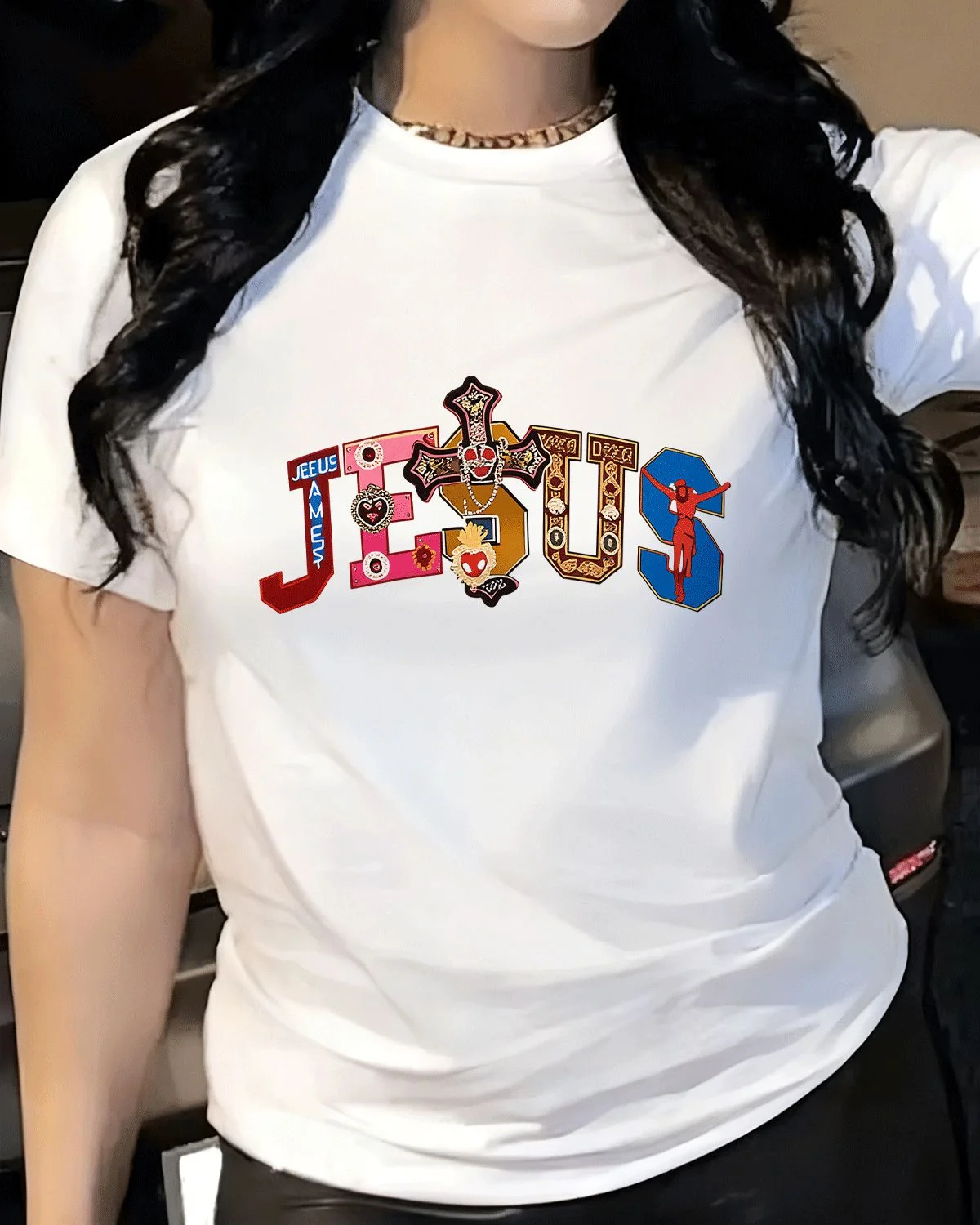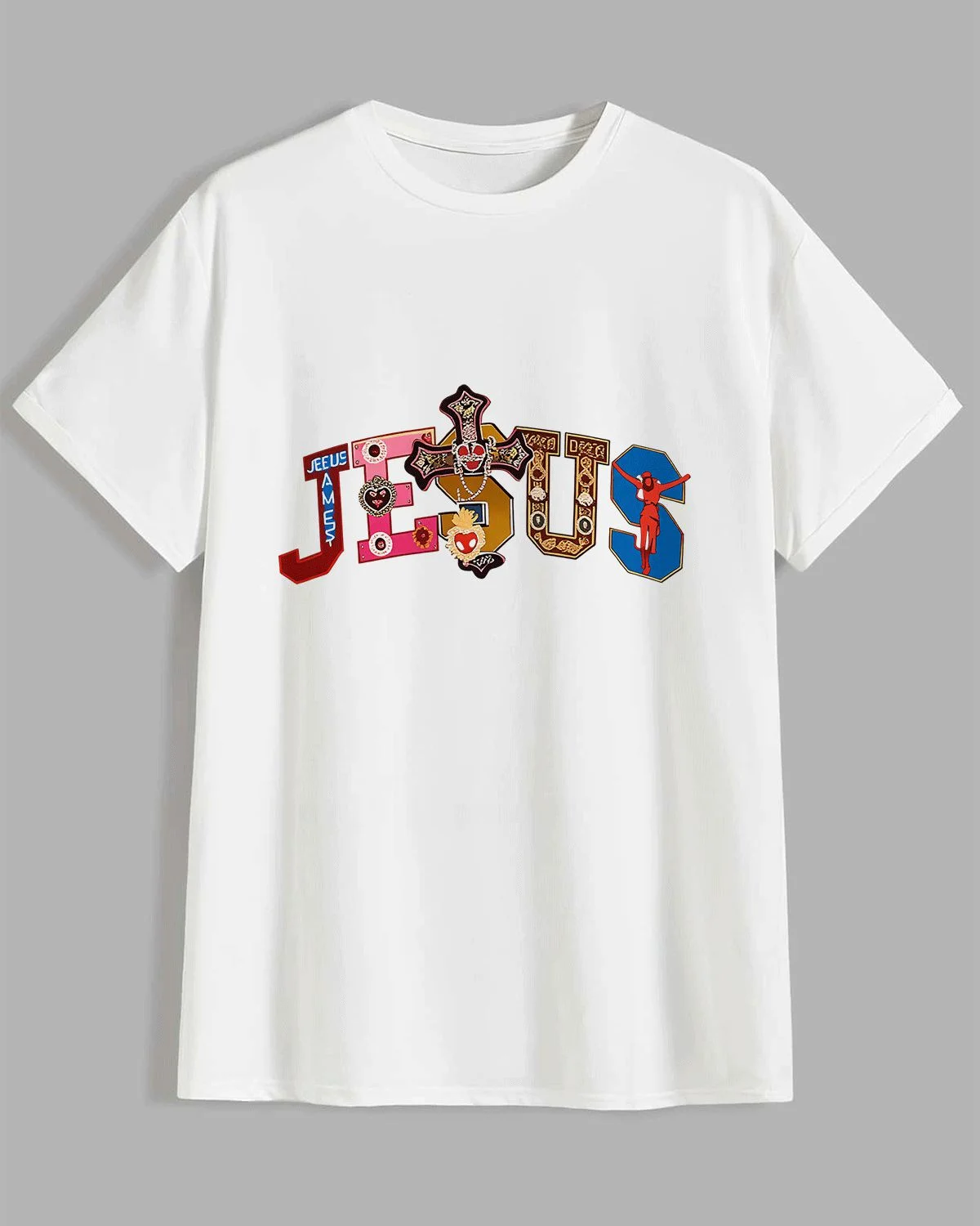 Jesus Name Cross Heart Summer Cotton Graphic T Shirt - Vintage Artistic,Short Sleeve,Soft Fabric,Comfortable Fit