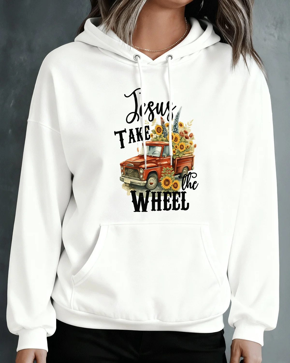 Jesus Take the Wheel Red Truck with Sunflowers Cozy Cotton Graphic Hoodie-Vintage Artistic,Long Sleeves,Soft Fabric,Comfortable Fit