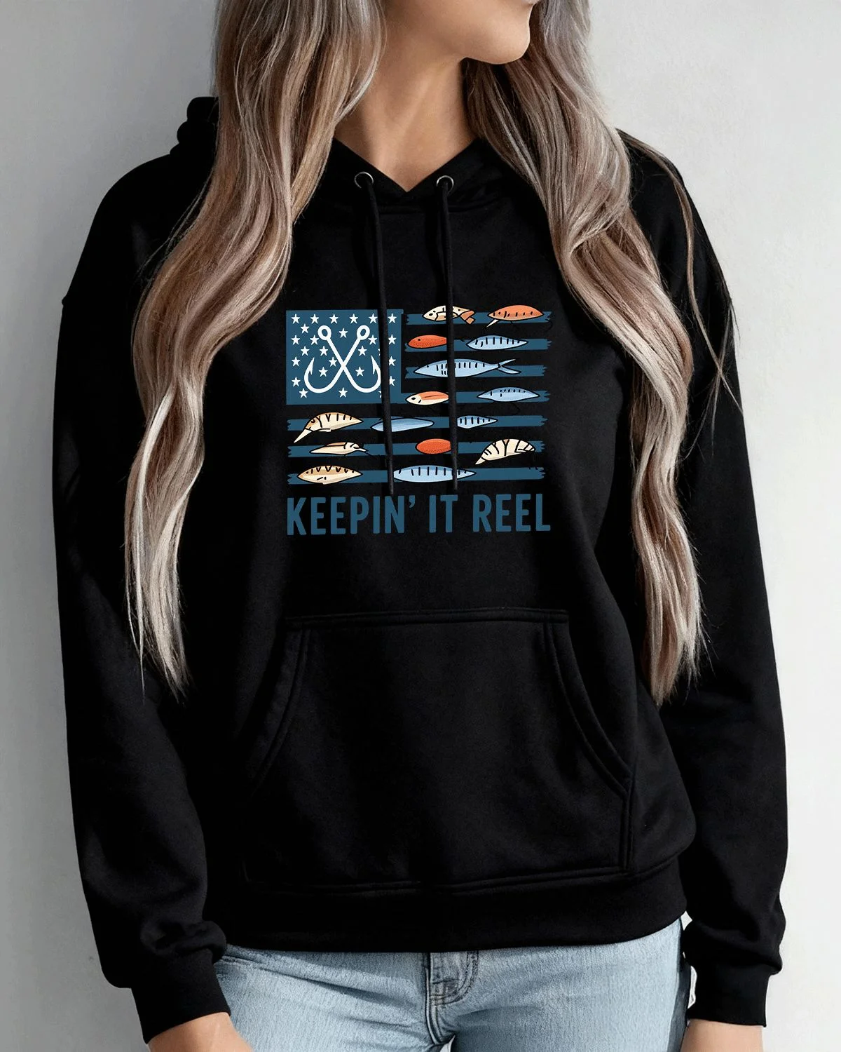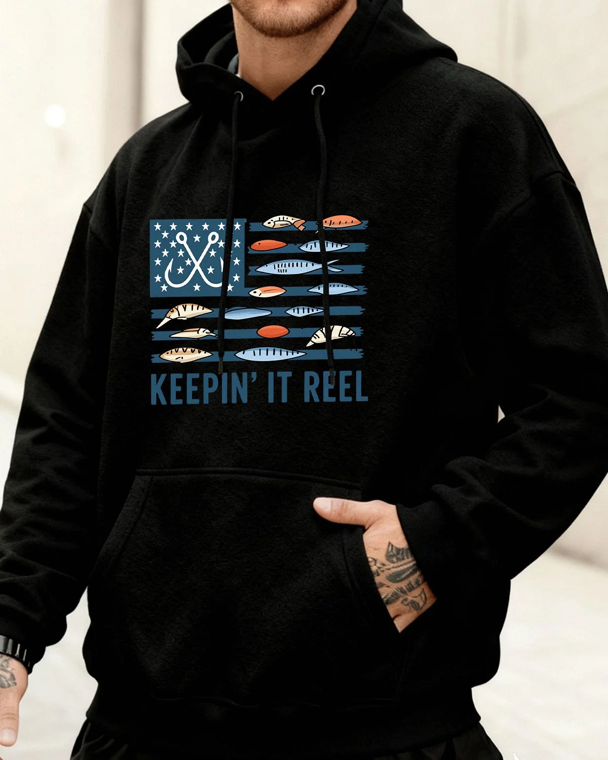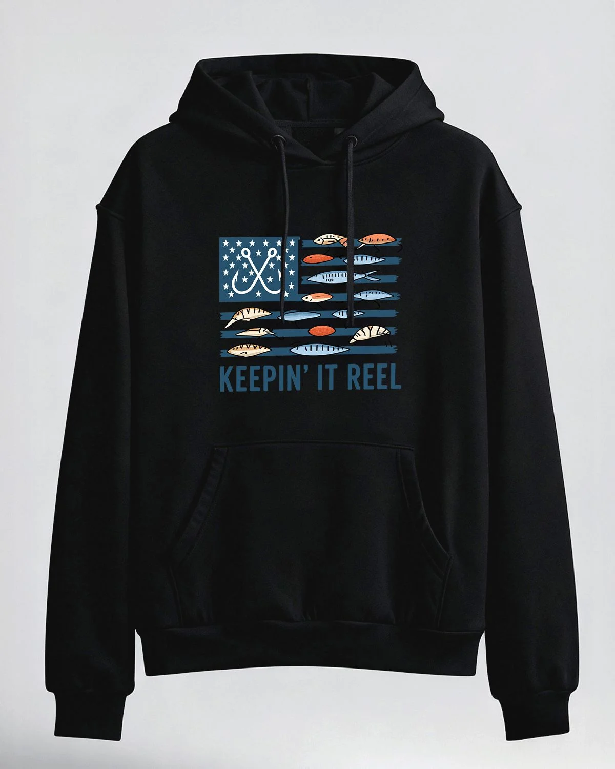 Keepin' It Reel American Fishing Flag Cozy Cotton Graphic Hoodie with Pocket-Casual Retro,Long Sleeve,Soft Fabric,Comfortable Fit