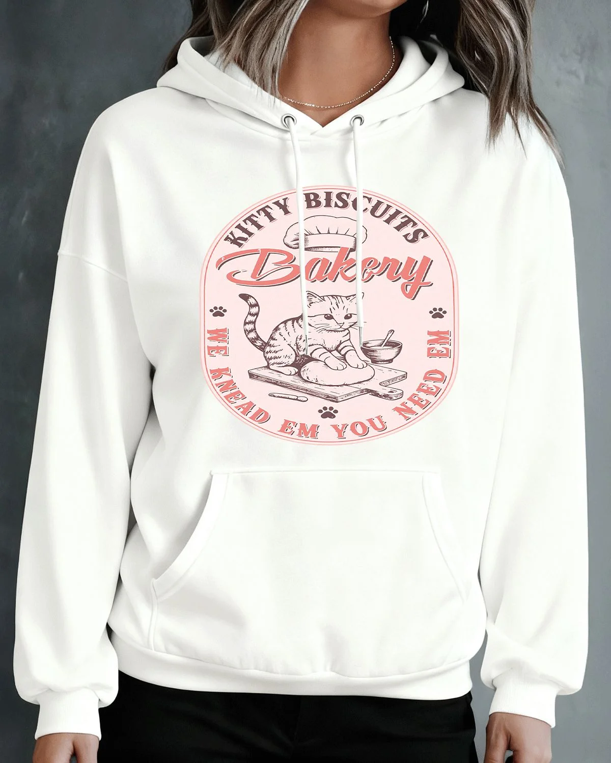 Kitty Birthday Bakery Cat Kneading Dough Cozy Graphic Hoodie for Men and Women - Funny Vintage, Long Sleeve, Soft Fabric, Comfortable Fit