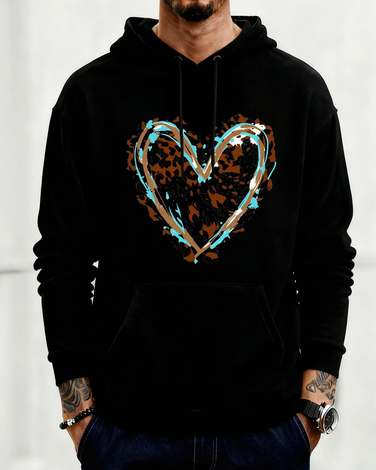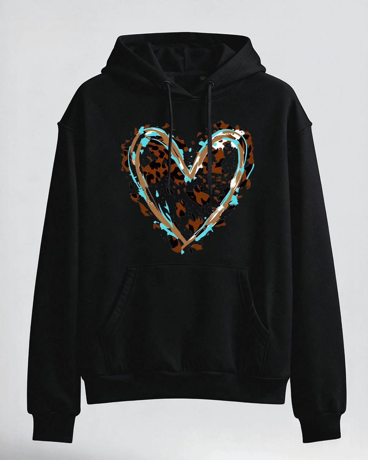 Leopard Print Aqua Brush Heart Summer Cozy Graphic Hoodie-Casual Artistic,Long Sleeve,Soft Fabric,Comfortable Fit