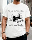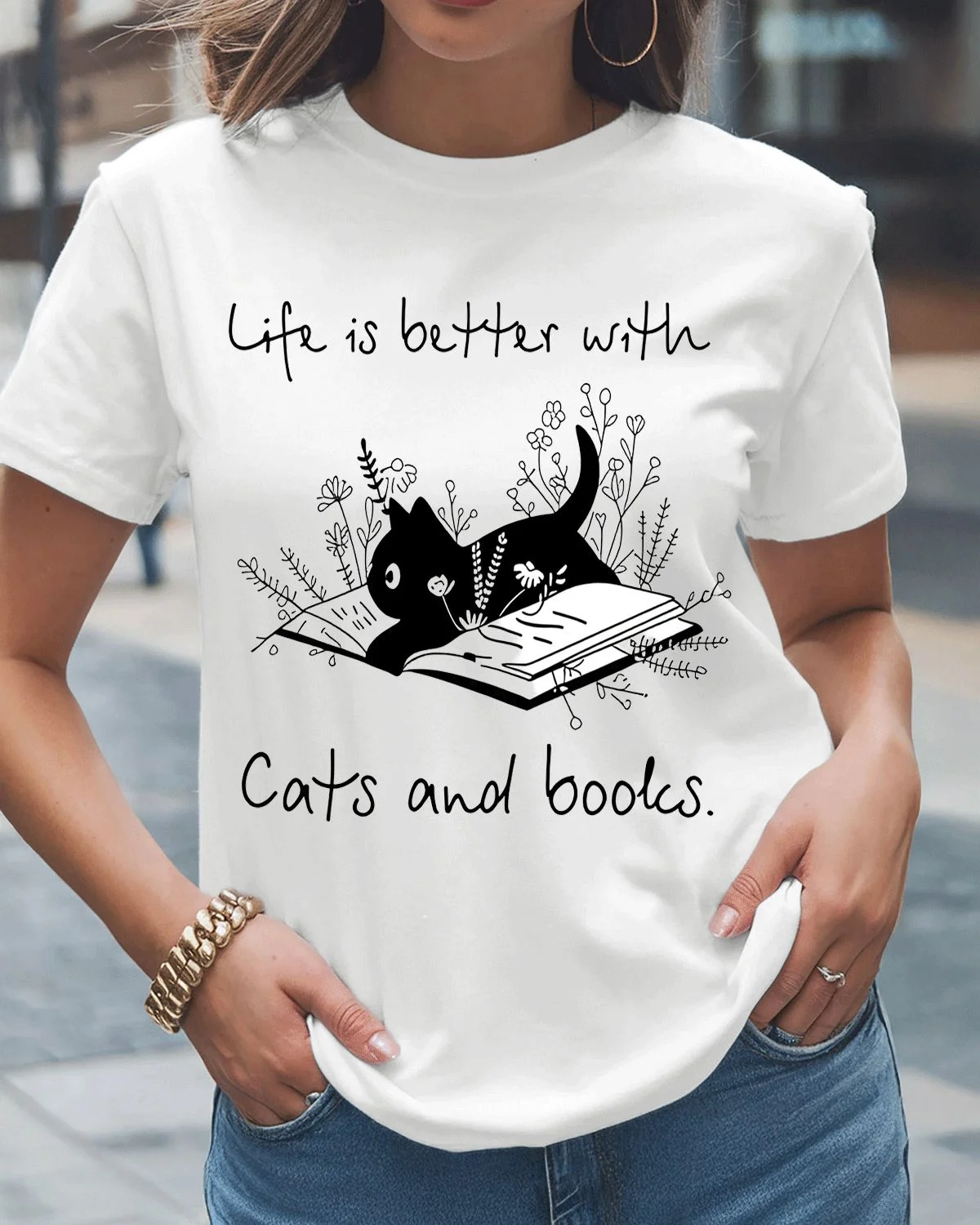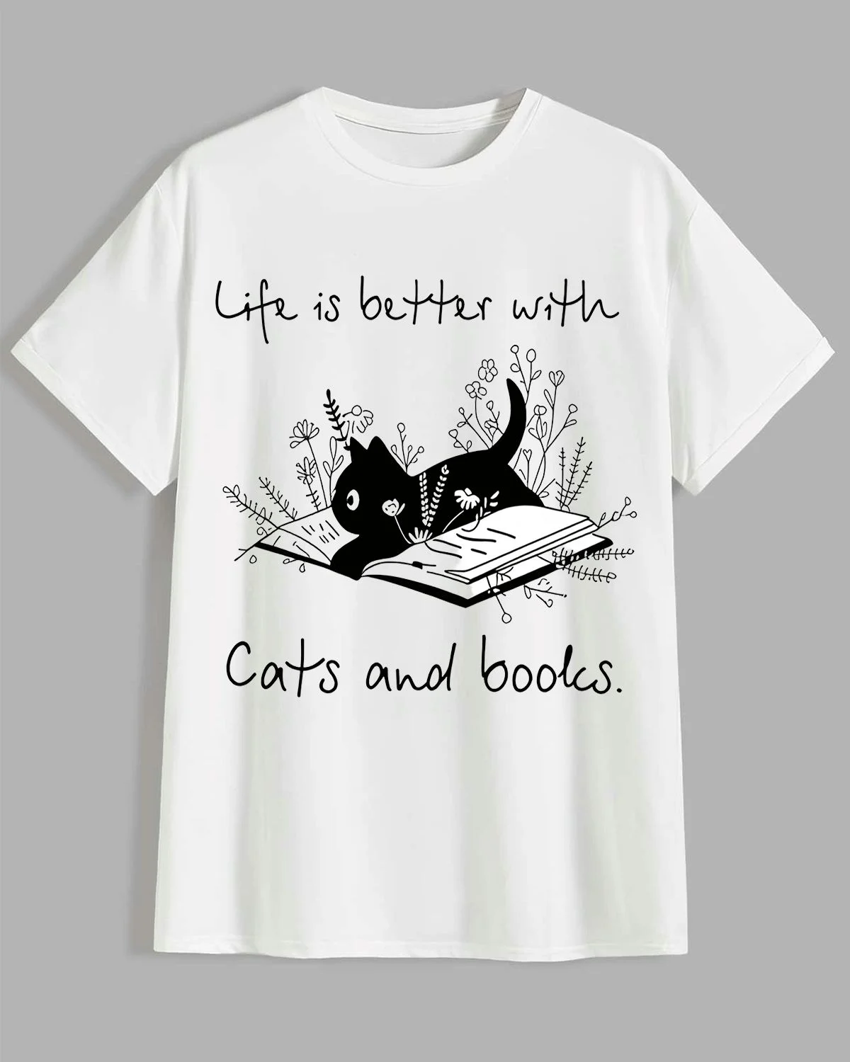 Life is Better with Cats and Books Summer Cotton Graphic T Shirt - Casual Artistic, Short Sleeve, Soft Fabric, Comfortable Fit