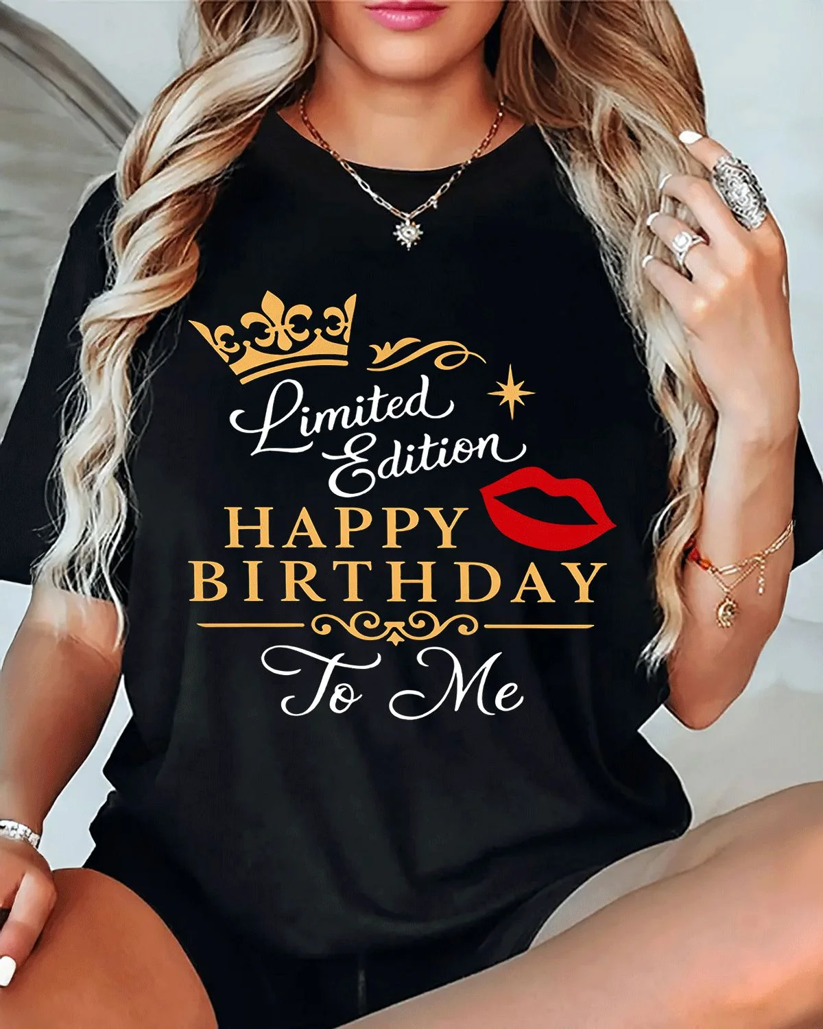 Limited Edition Happy Birthday To Me with Crown and Lips Summer Cotton Graphic T Shirt - Casual Chic, Short Sleeve, Soft Fabric, Comfortable Fit