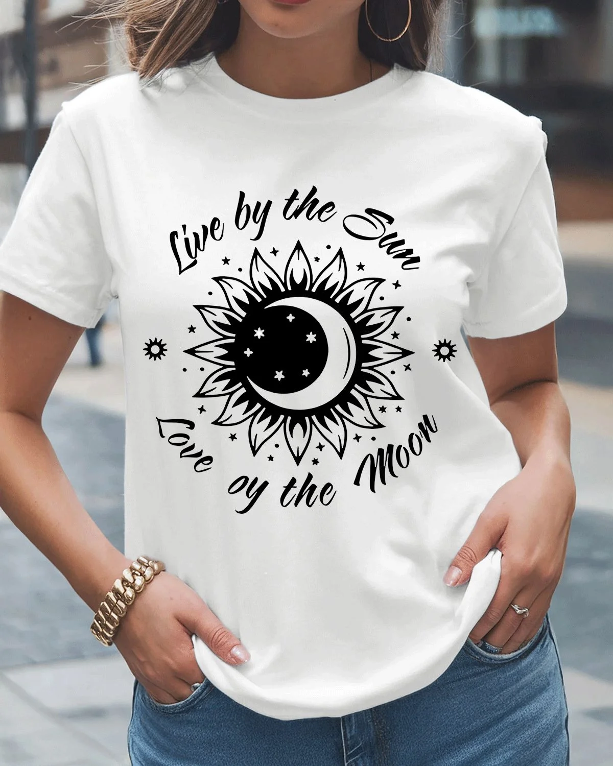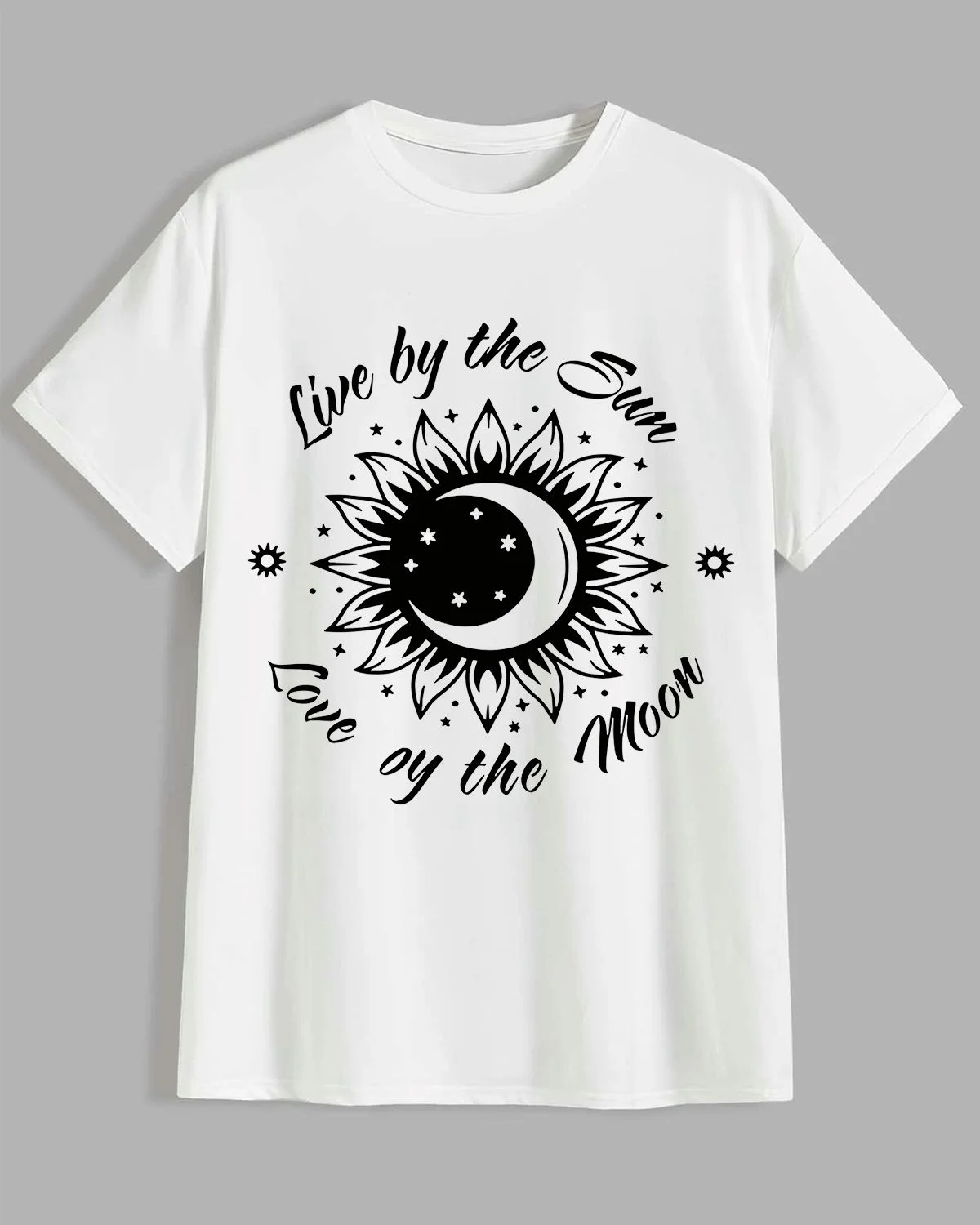 Live by the Sun Love by the Moon Summer Cotton Graphic T Shirt - Vintage Boho, Short Sleeve, Soft Fabric, Comfortable Fit