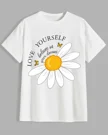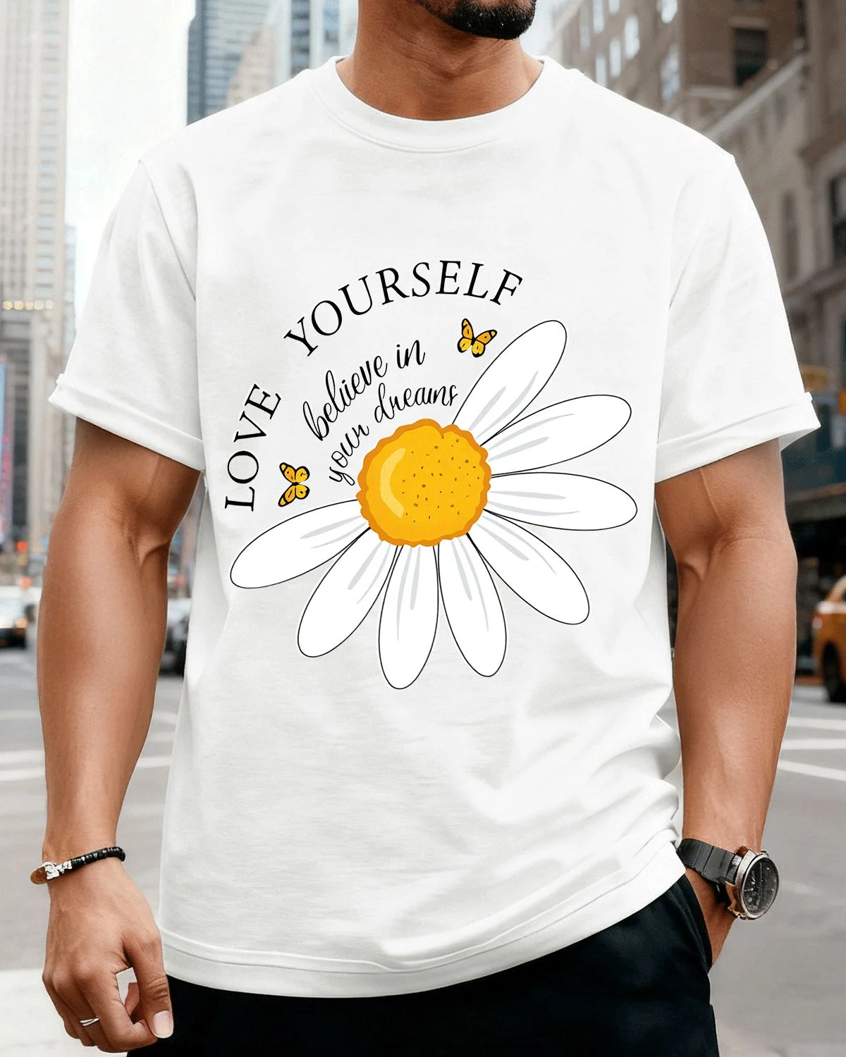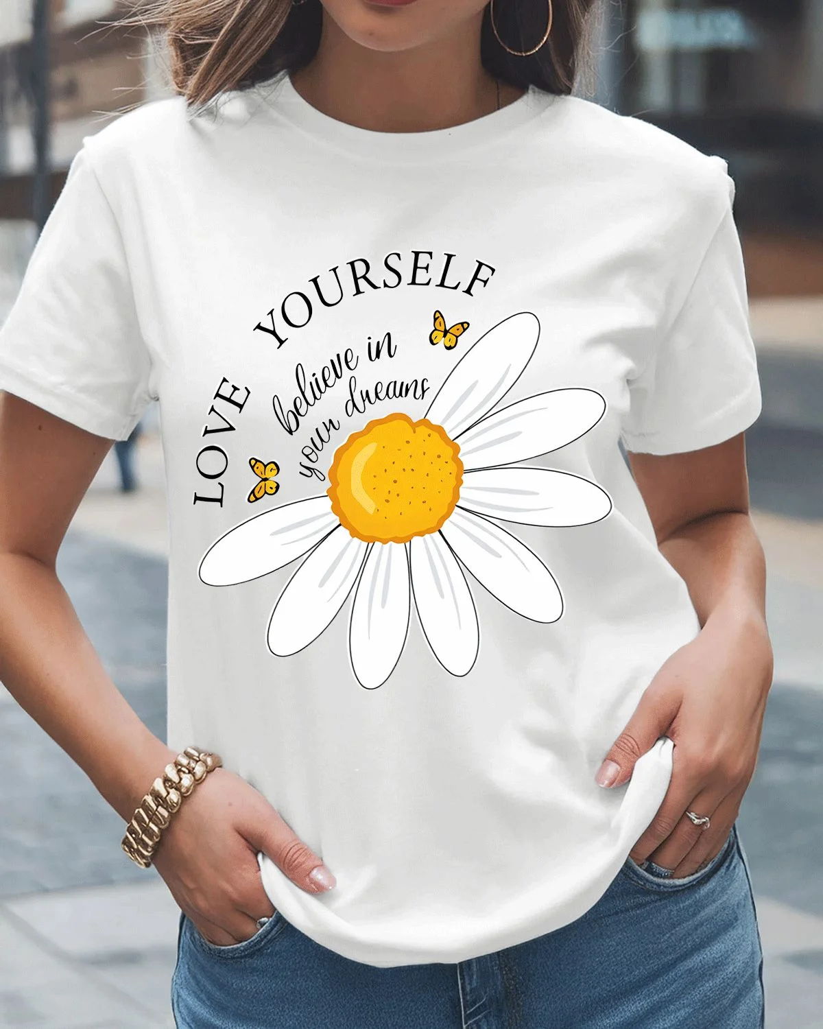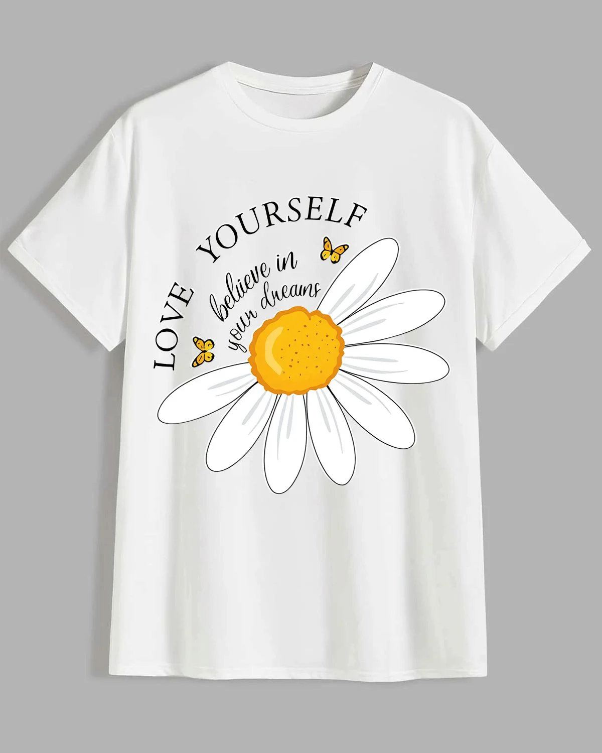 Love Yourself Believe in Your Dreams Daisy Summer Cotton Graphic T Shirt - Casual Artistic, Short Sleeve, Soft Fabric, Comfortable Fit