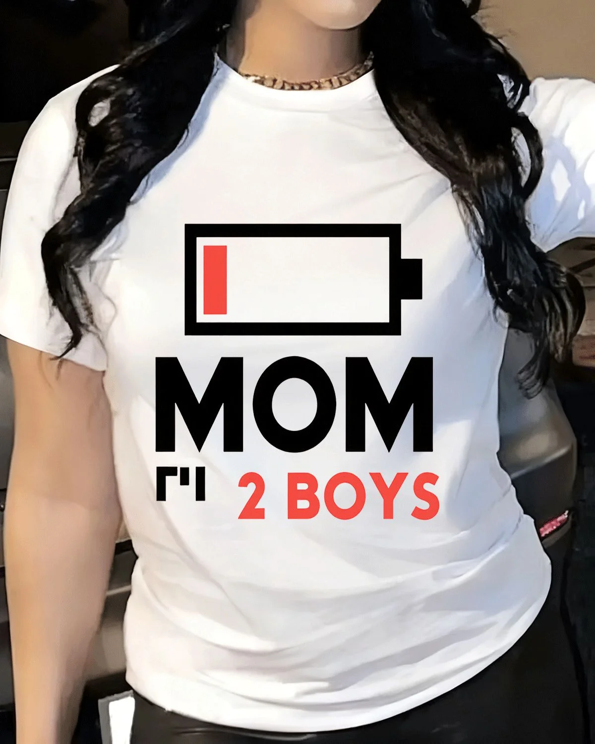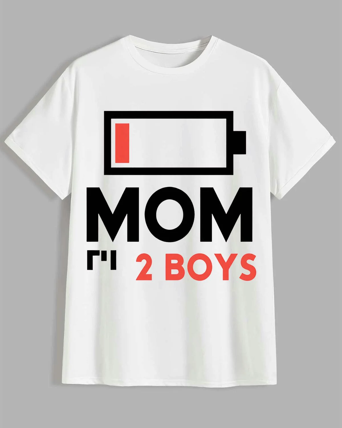 Low Battery Mom of 2 Boys Summer Cotton Graphic T Shirt - Funny Casual, Short Sleeve, Soft Fabric, Comfortable Fit
