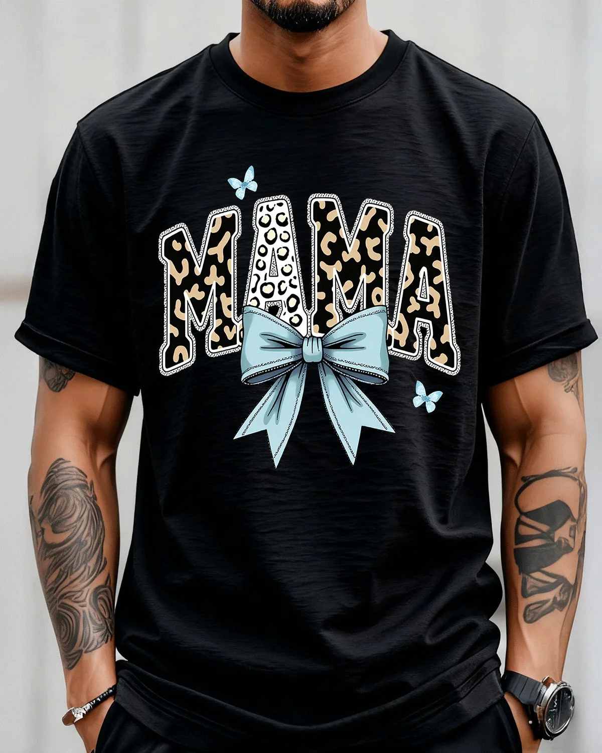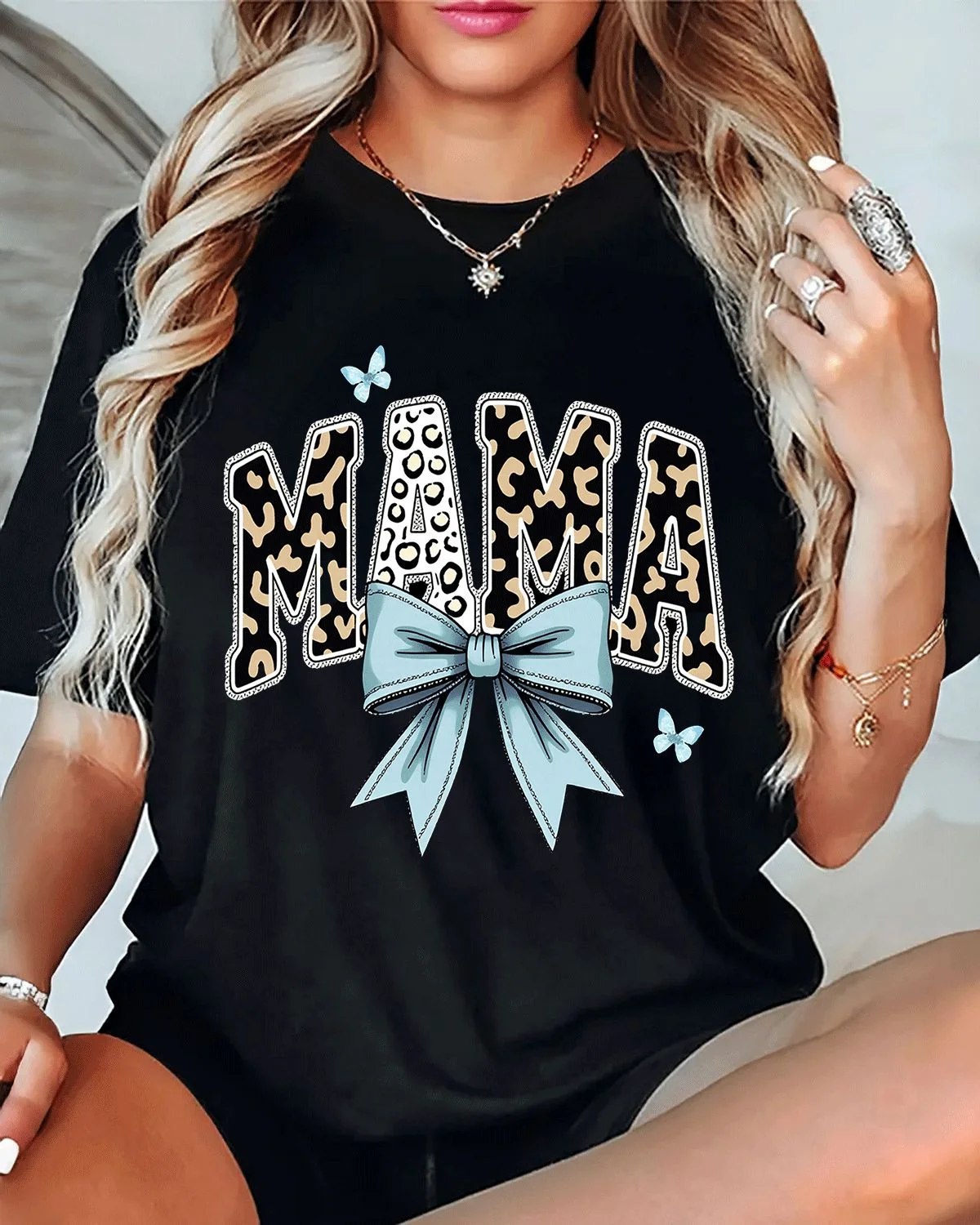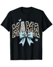 Mama Leopard Print Blue Bow Summer Cotton Graphic T Shirt-Casual Chic,Short Sleeve,Soft Fabric,Comfortable Fit
