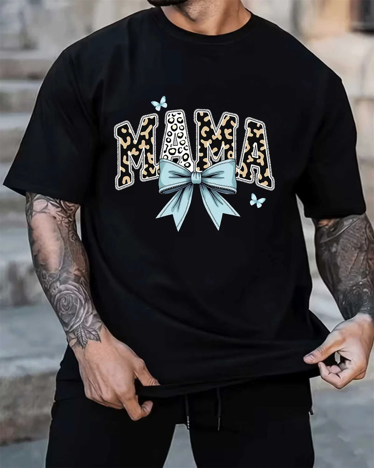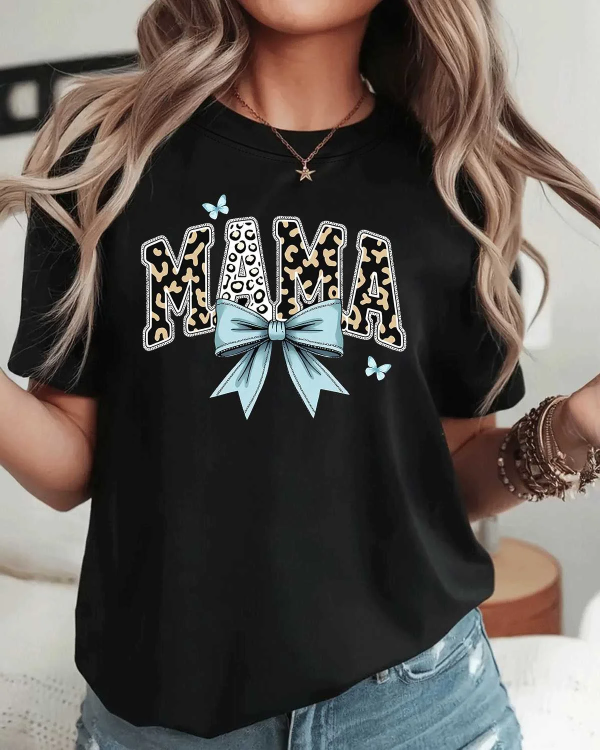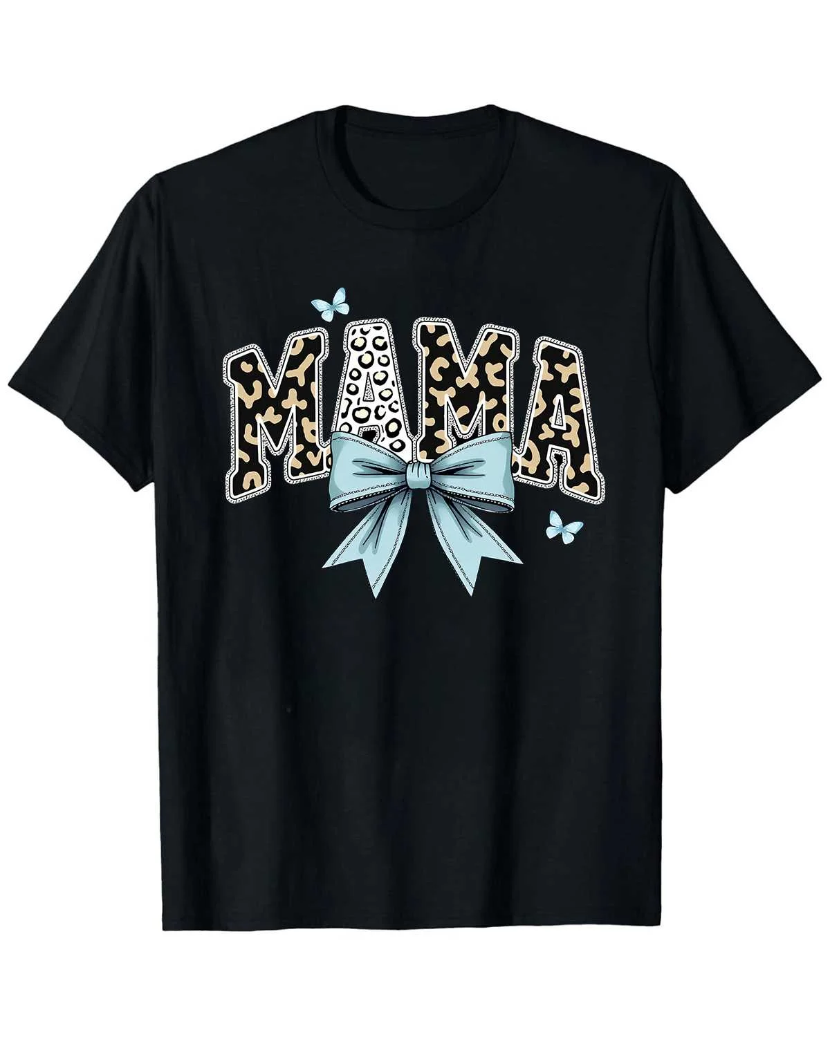 Mama Leopard Print Blue Bow Summer Cotton Graphic T Shirt-Casual Chic,Short Sleeve,Soft Fabric,Comfortable Fit