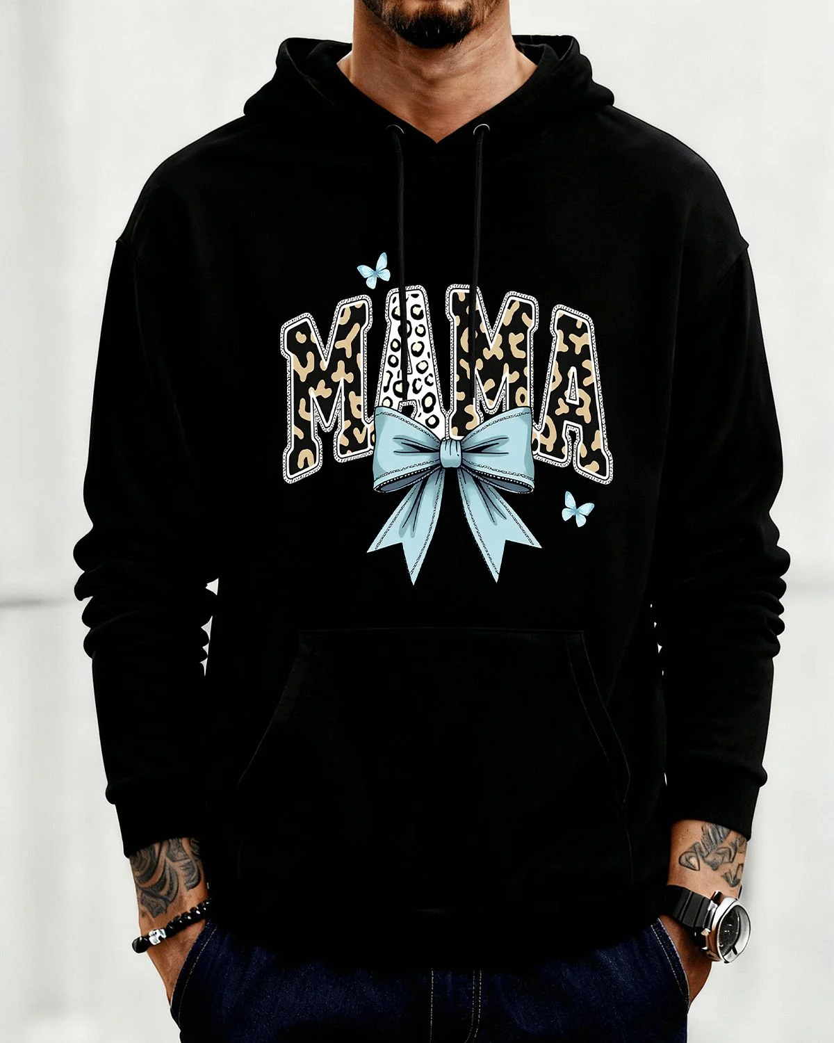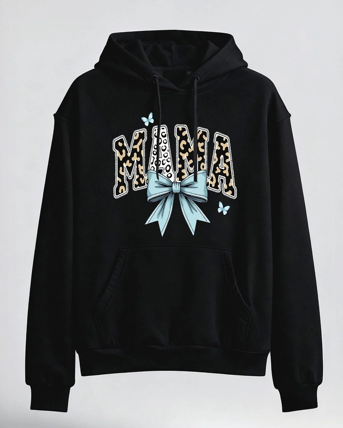 Mama Leopard Print Blue Bow Summer Cozy Graphic Hoodie-Casual Chic,Long Sleeve,Soft Fabric,Comfortable Fit