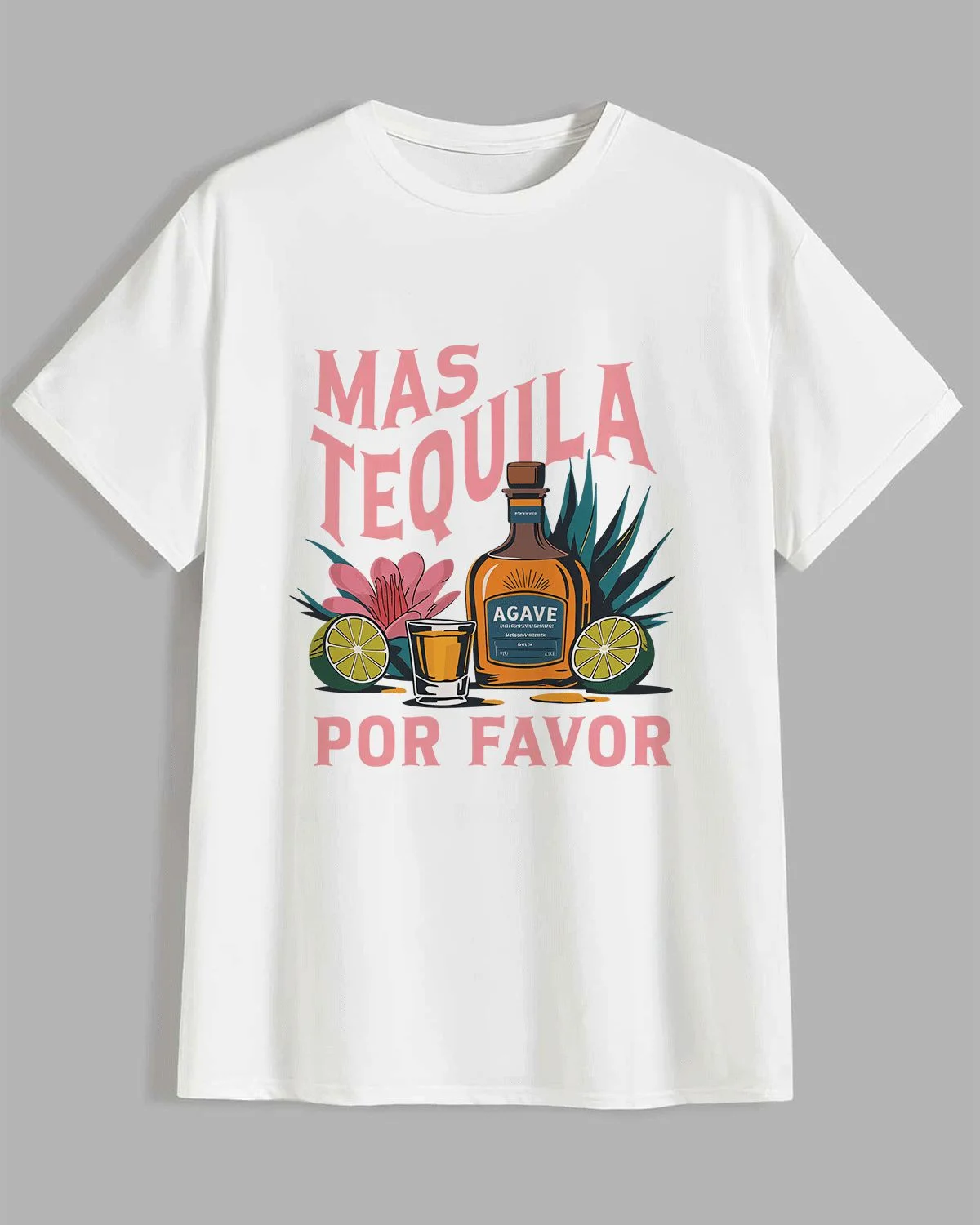 Mas Tequila Por Favor Agave Bottle Summer Cotton Graphic T Shirt - Casual Vintage,Short Sleeve,Soft Fabric,Comfortable Fit