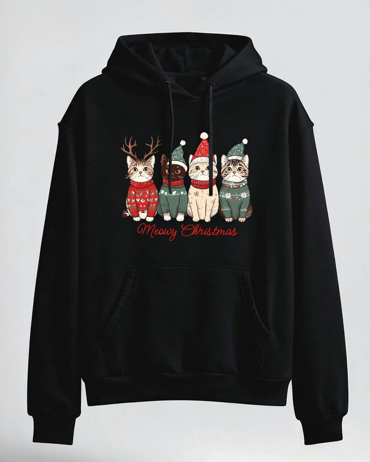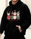 Meowy Christmas Cats in Holiday Sweaters Cozy Cotton Graphic Hoodie with Pocket-Casual Vintage,Long Sleeve,Soft Fabric,Comfortable Fit