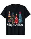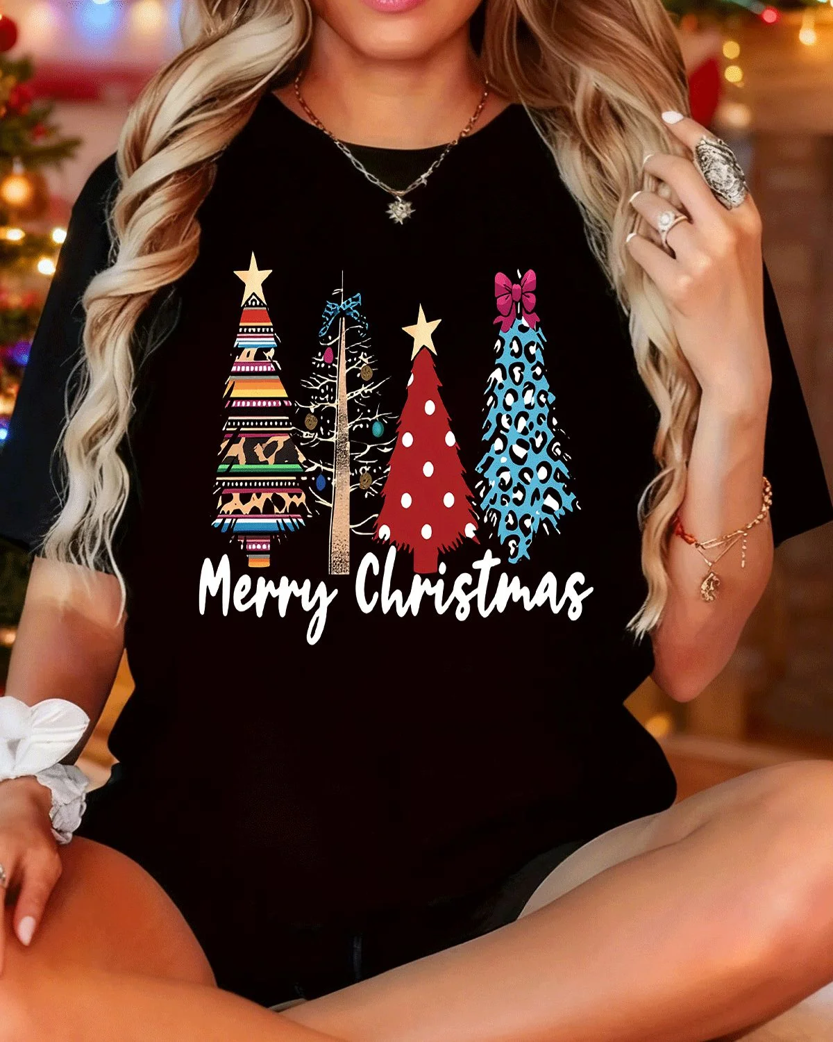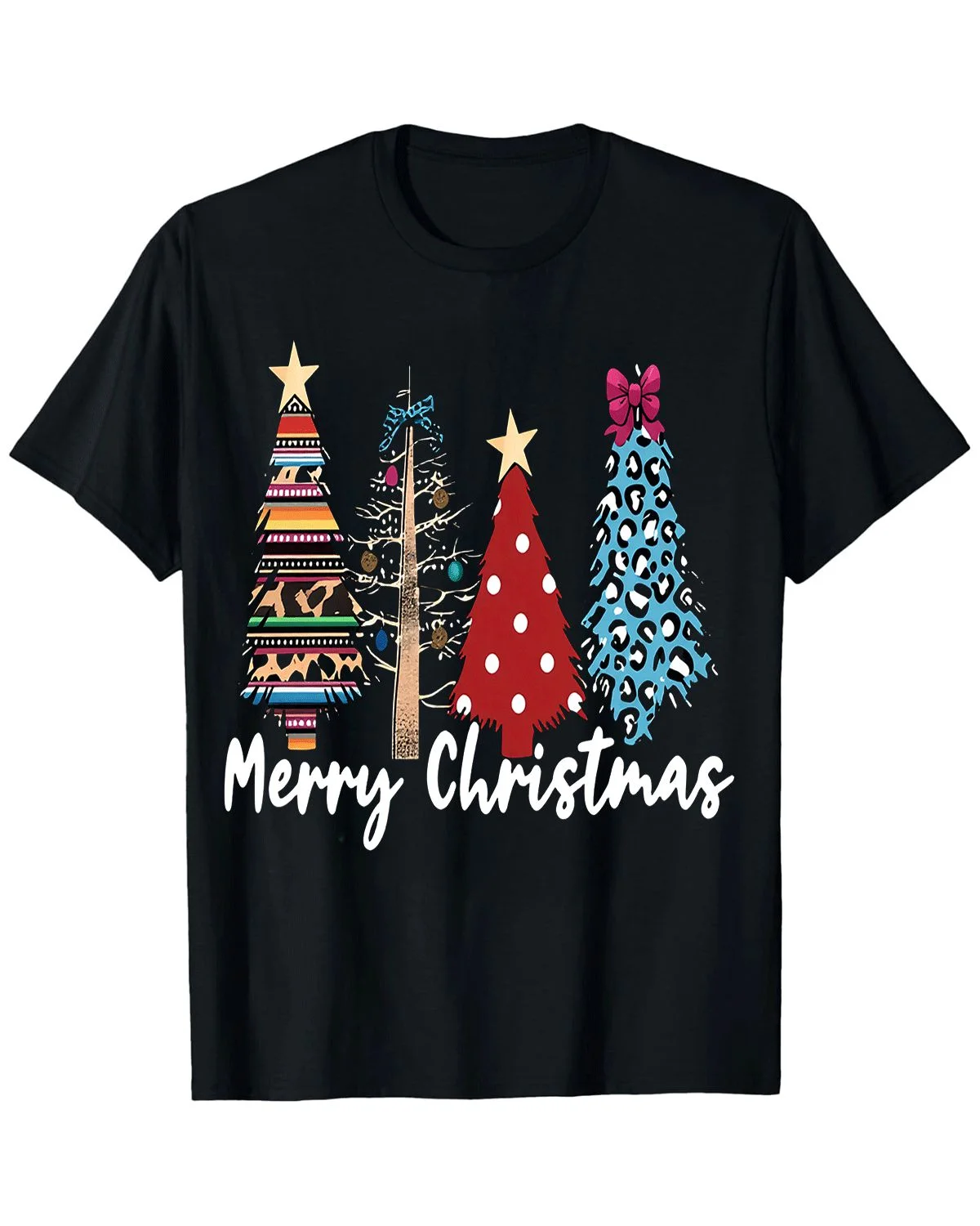 Merry Christmas Patterned Trees Summer Cotton Graphic T Shirt - Casual Vintage, Short Sleeve, Soft Fabric, Comfortable Fit