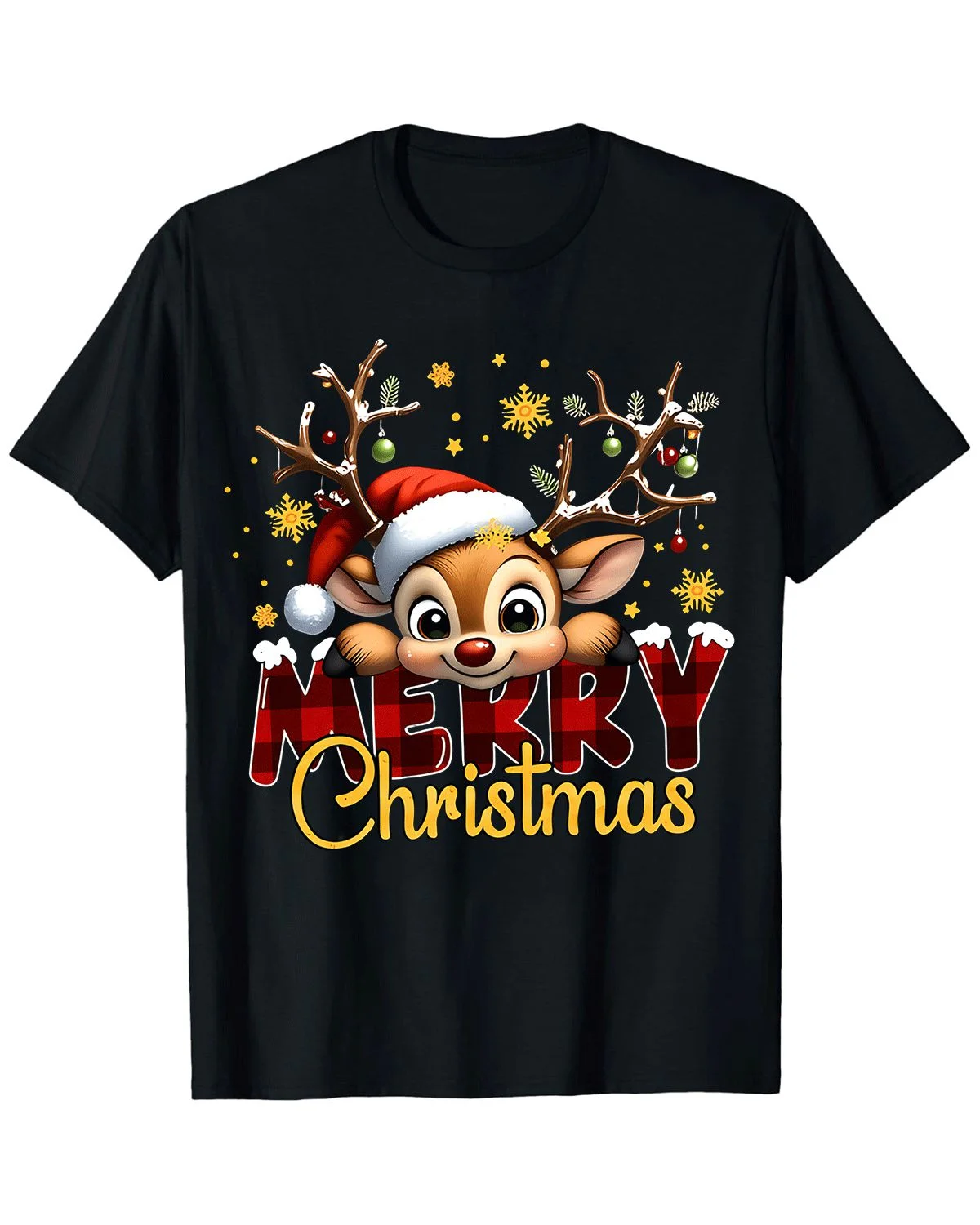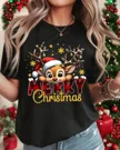 Merry Christmas Reindeer with Santa Hat Summer Cotton Graphic T Shirt - Casual Vintage, Short Sleeve, Soft Fabric, Comfortable Fit