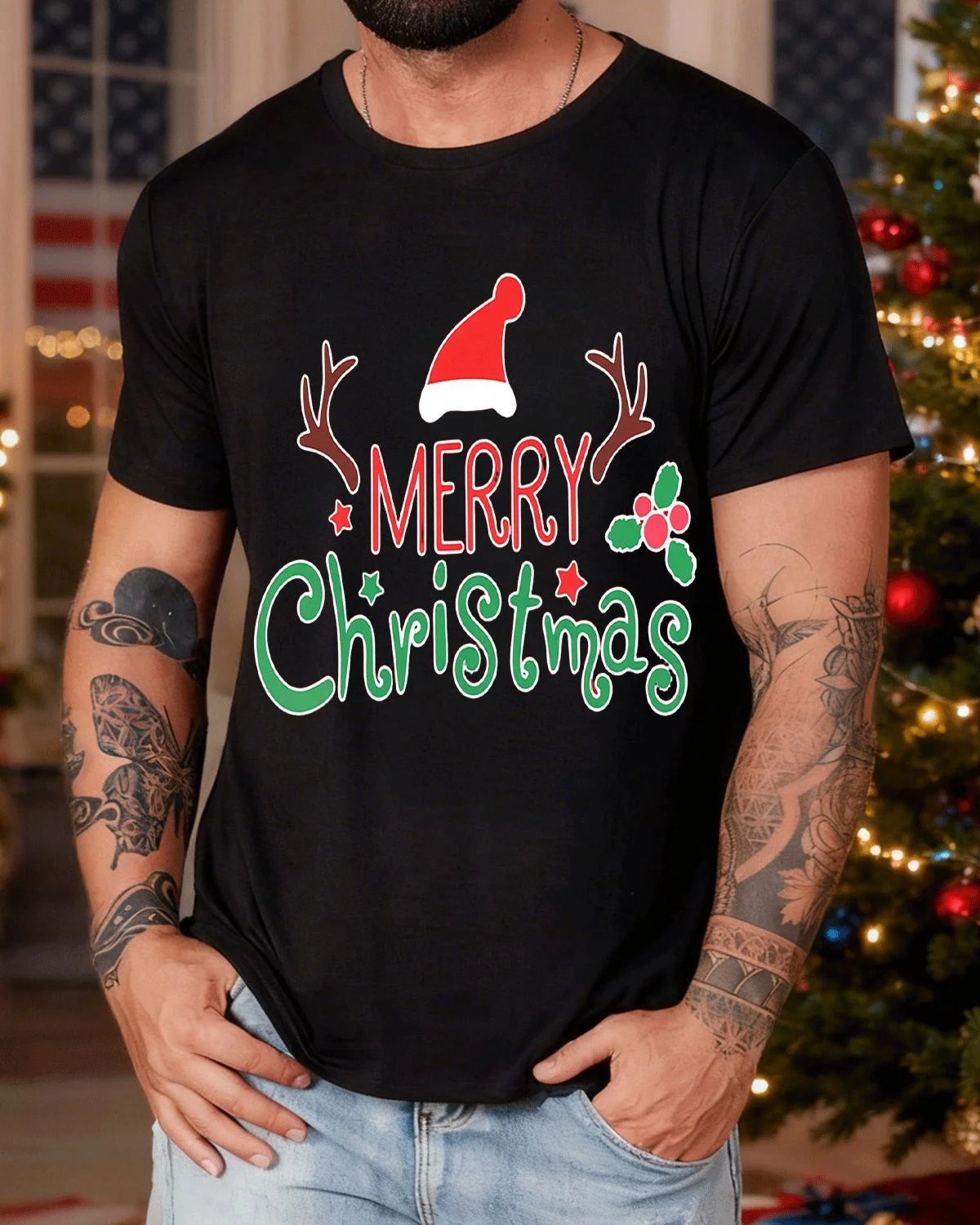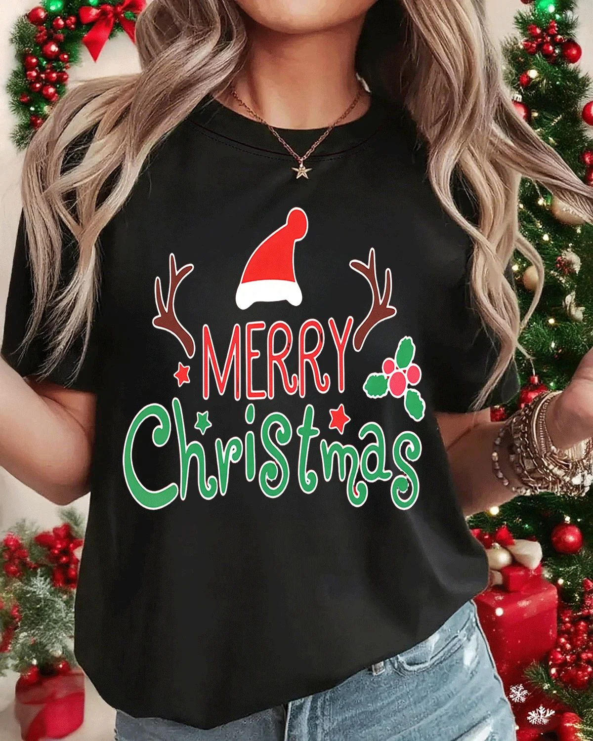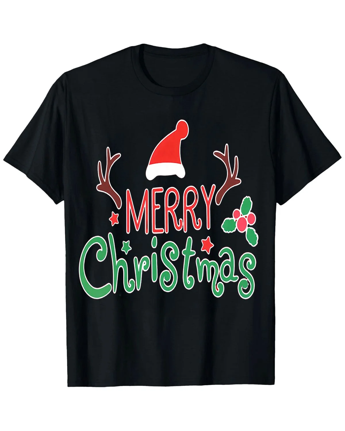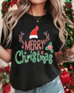 Merry Christmas Santa Hat and Reindeer Antlers Summer Cotton Graphic T Shirt - Casual Vintage, Short Sleeve, Soft Fabric, Comfortable Fit
