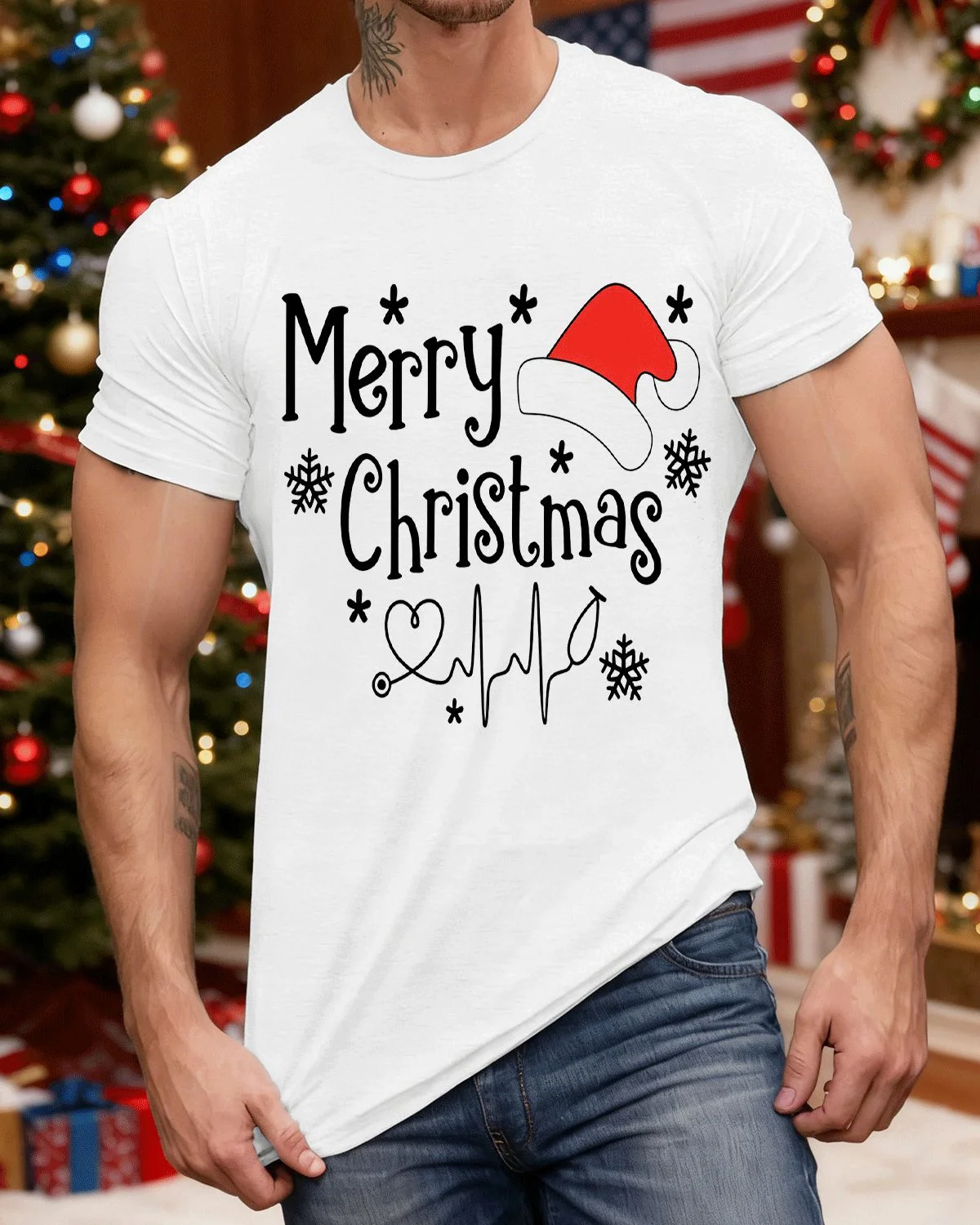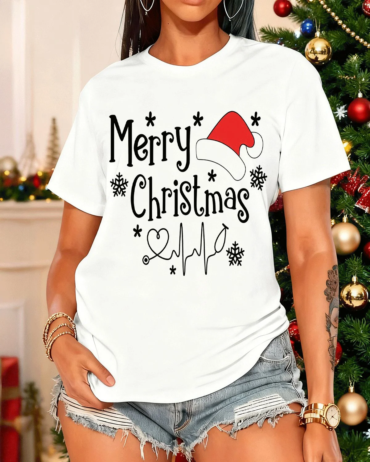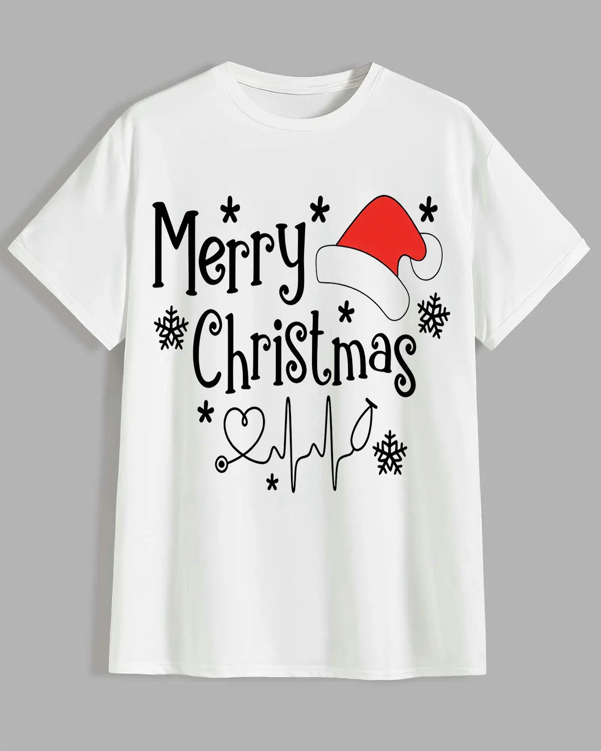 Merry Christmas Santa Hat and Snowflakes Summer Cotton Graphic T Shirt - Casual Vintage, Short Sleeve, Soft Fabric, Comfortable Fit