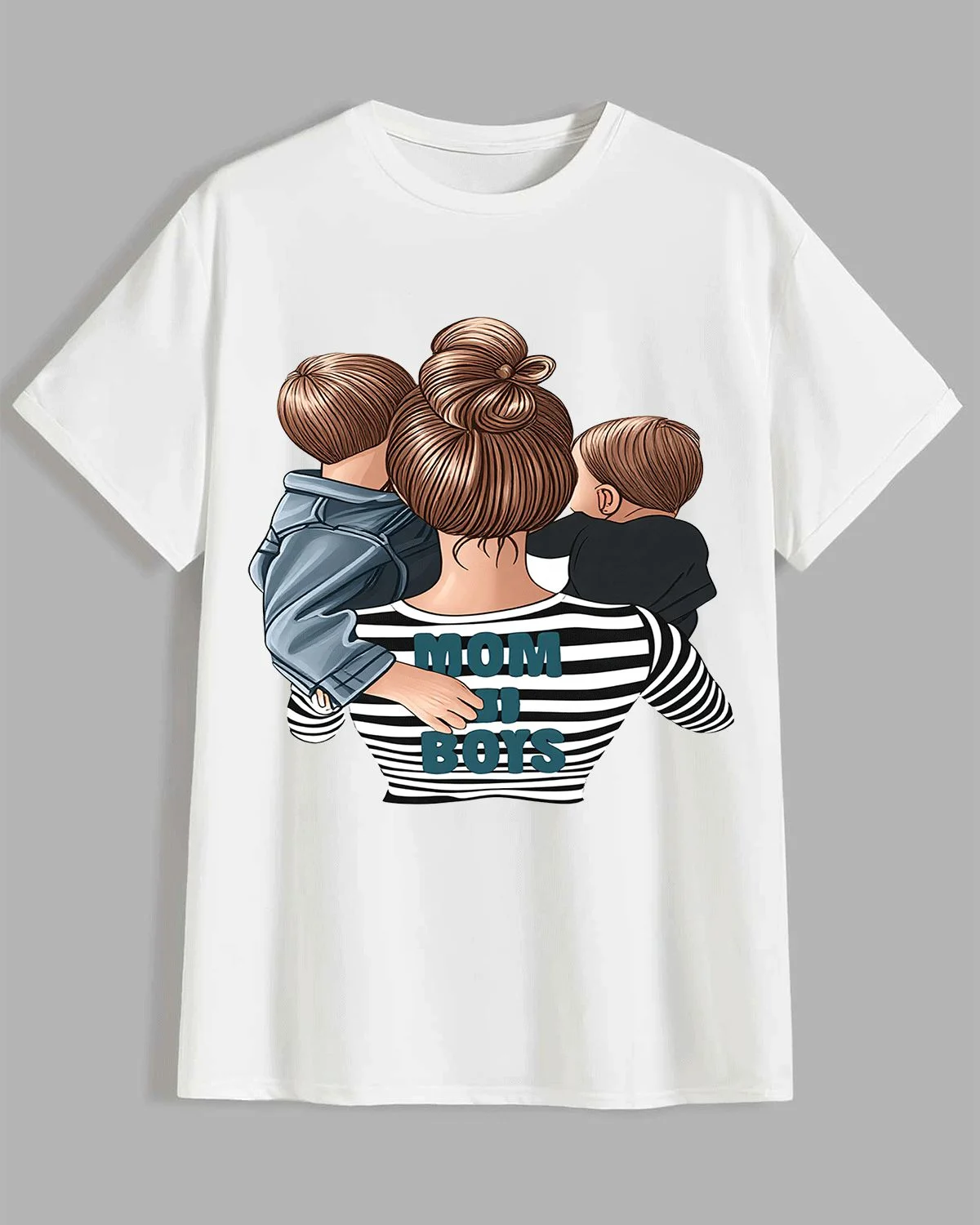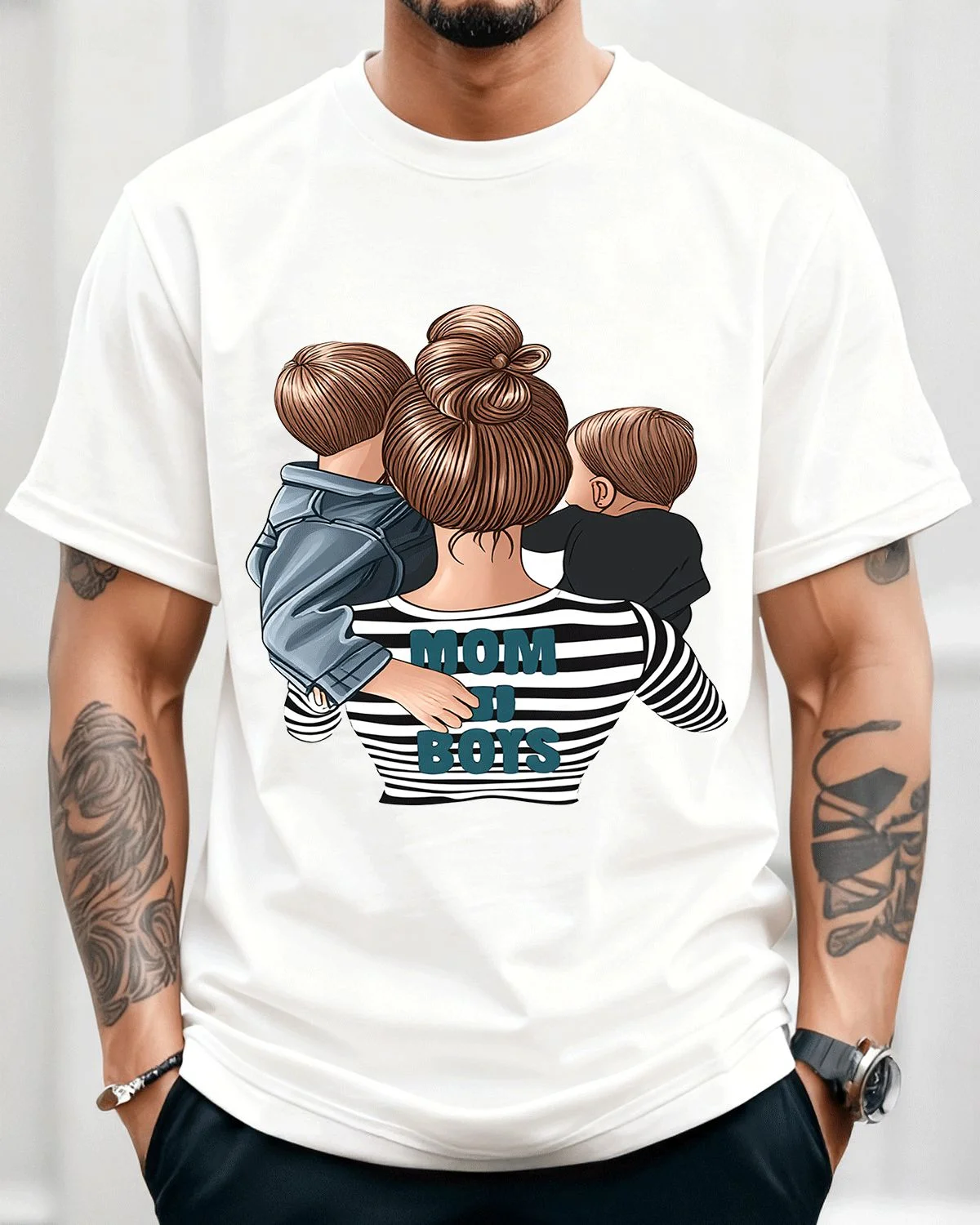 Mom of Boys Striped Shirt Illustration Summer Cotton Graphic T Shirt - Casual Graphic, Short Sleeve, Soft Fabric, Comfortable Fit