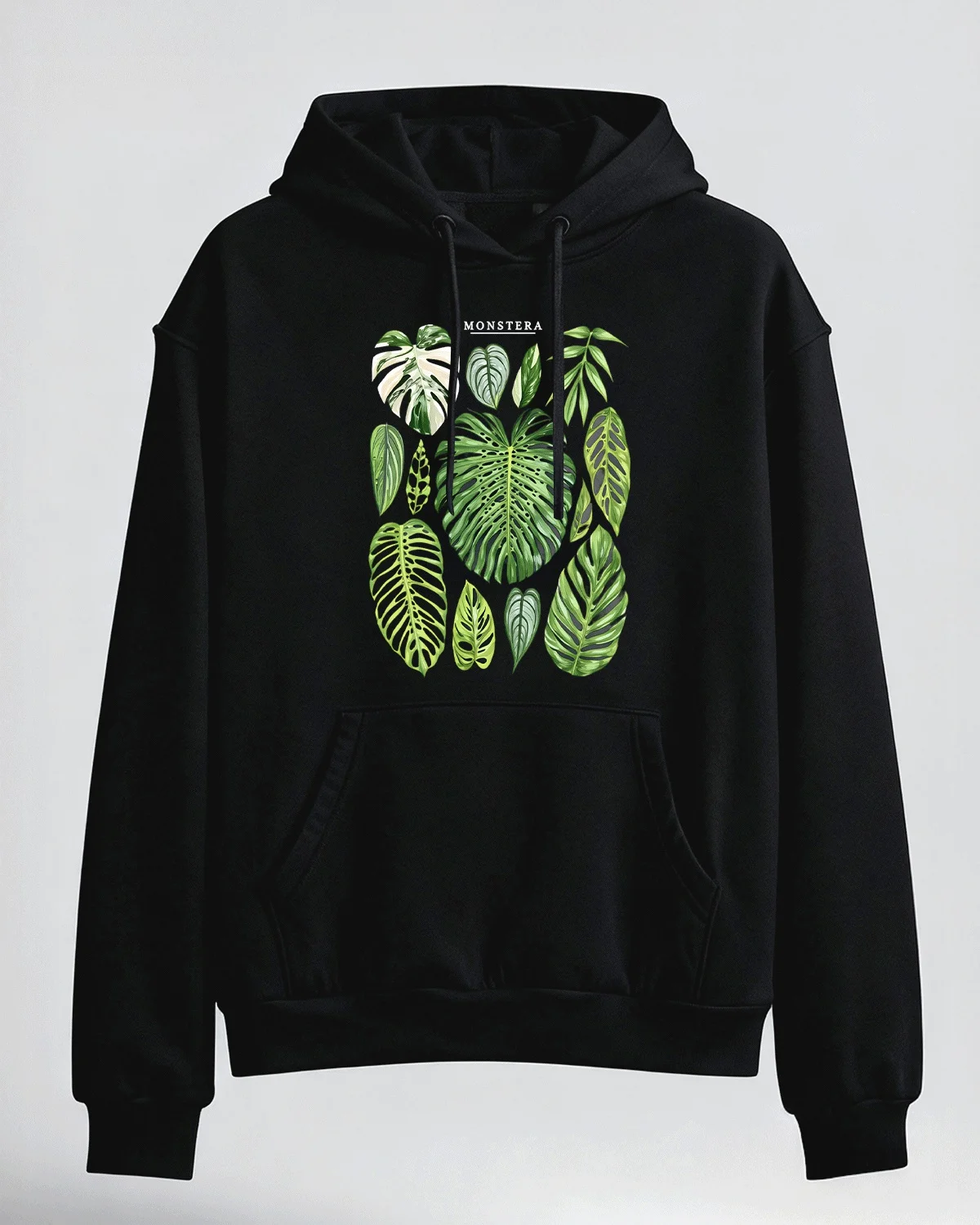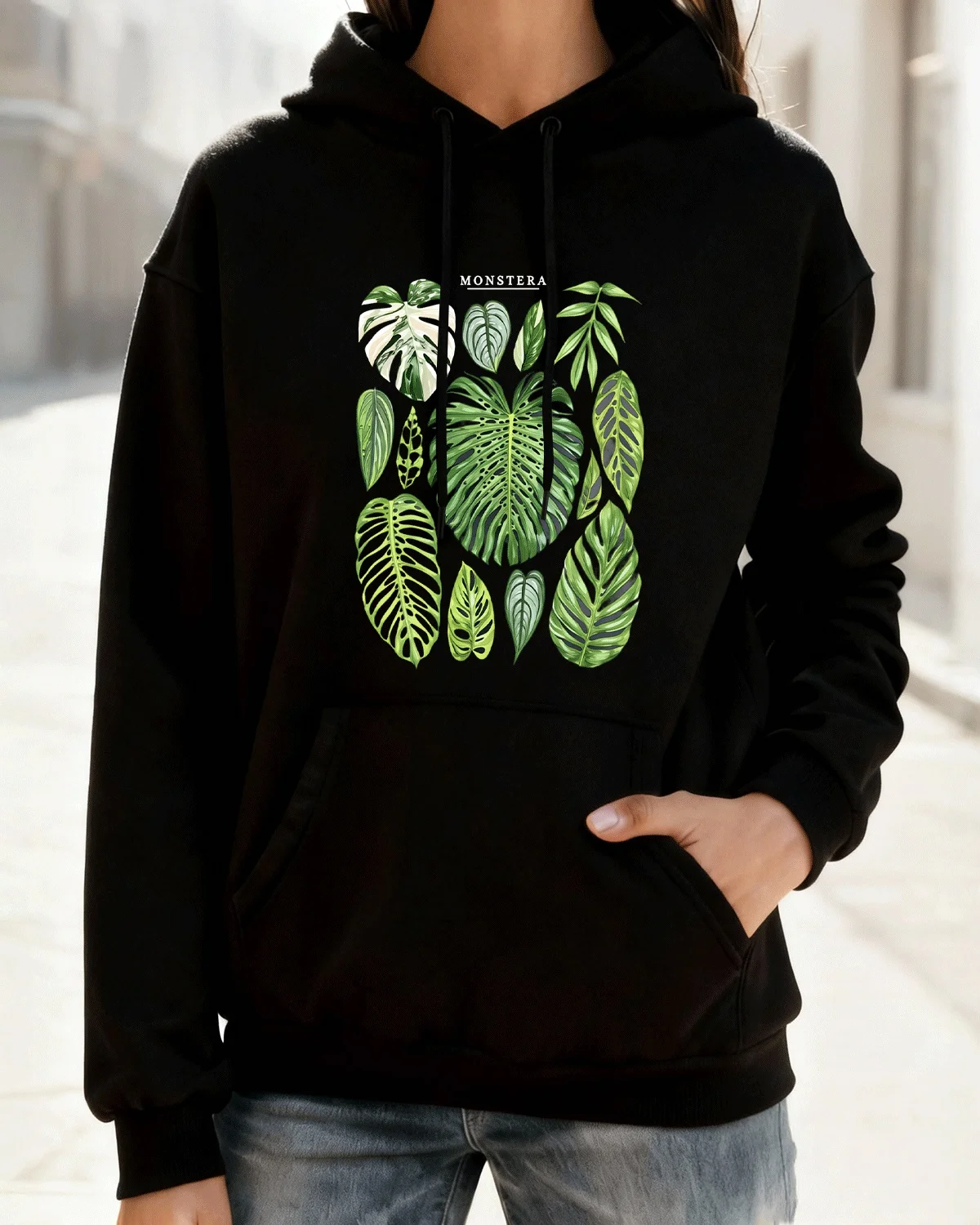 Monstera Tropical Leaves Cozy Cotton Graphic Hoodie-Casual Artistic,Long Sleeves,Soft Fabric,Comfortable Fit