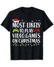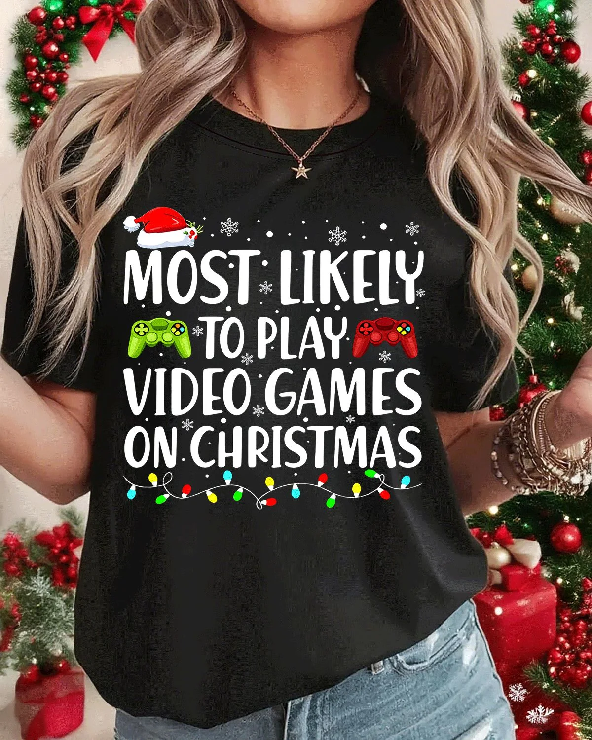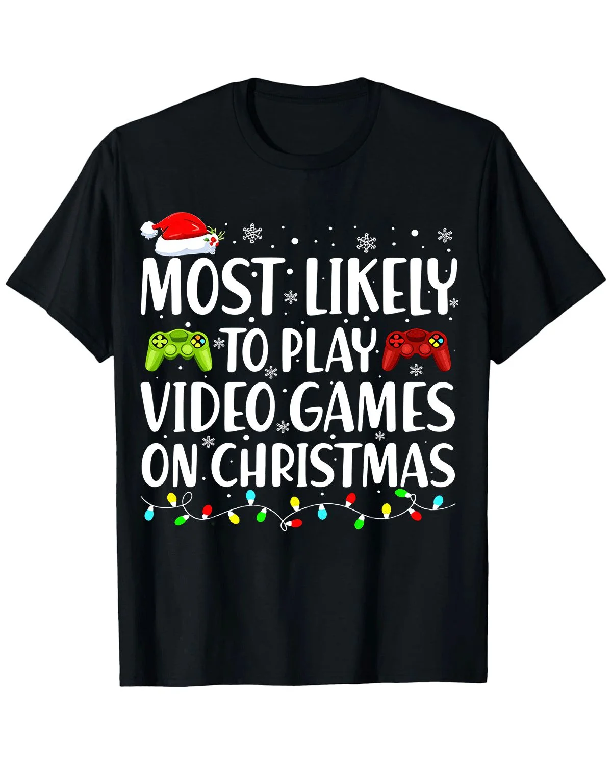 Most Likely to Play Video Games on Christmas Summer Cotton Graphic T Shirt - Funny Casual, Short Sleeve, Soft Fabric, Comfortable Fit
