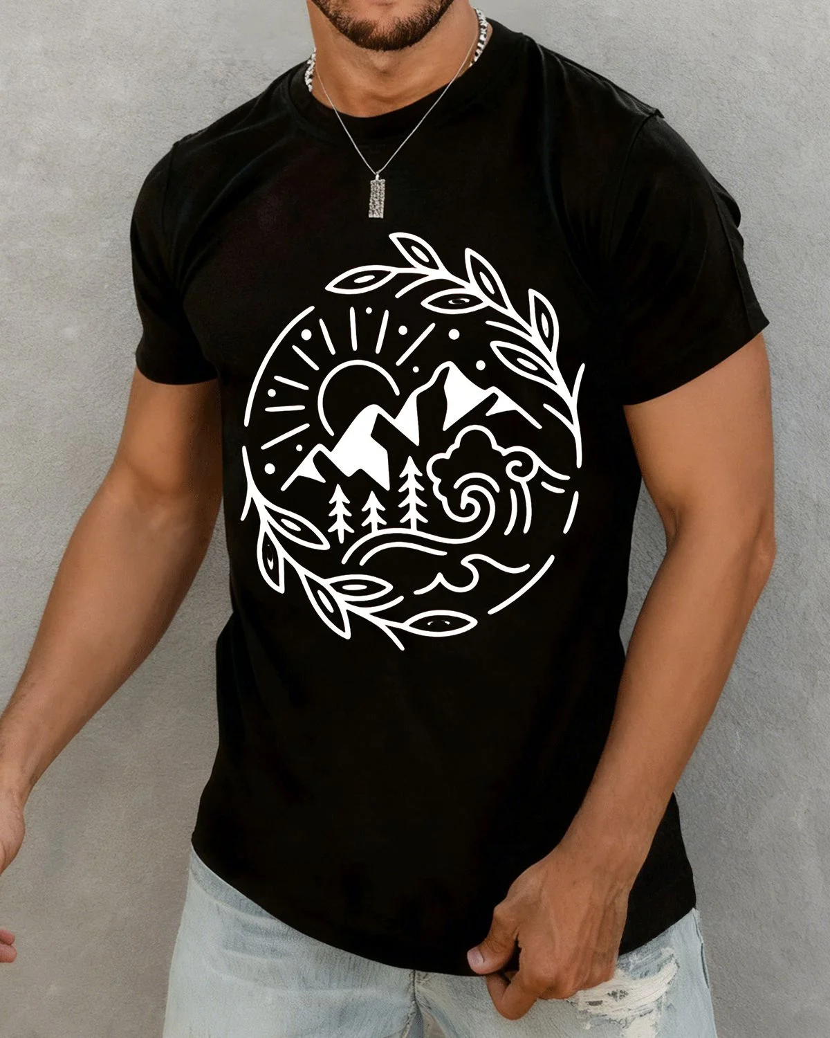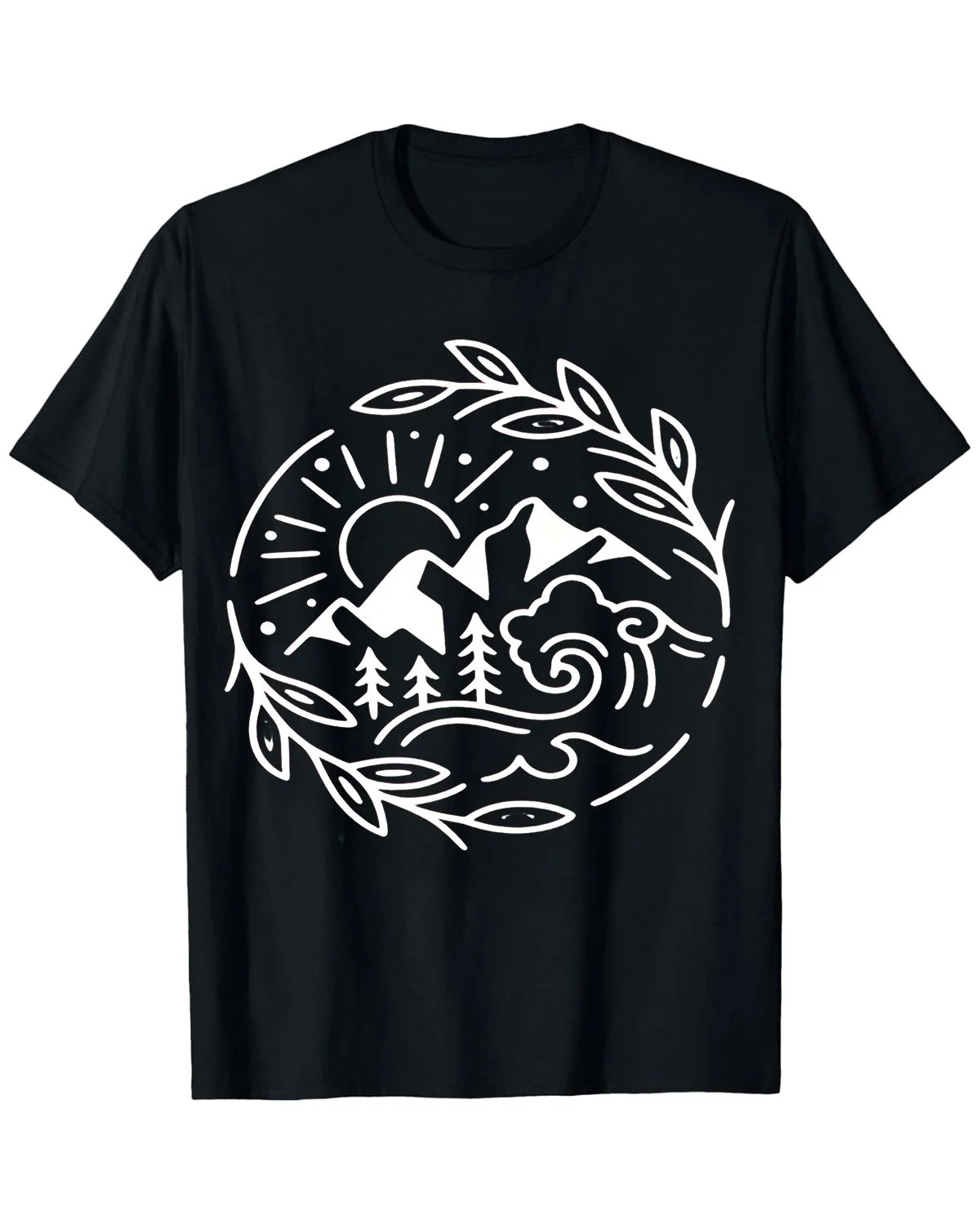 Mountain Sunset Forest Waves Summer Cotton Graphic T Shirt - Vintage Artistic, Short Sleeve, Soft Fabric, Comfortable Fit