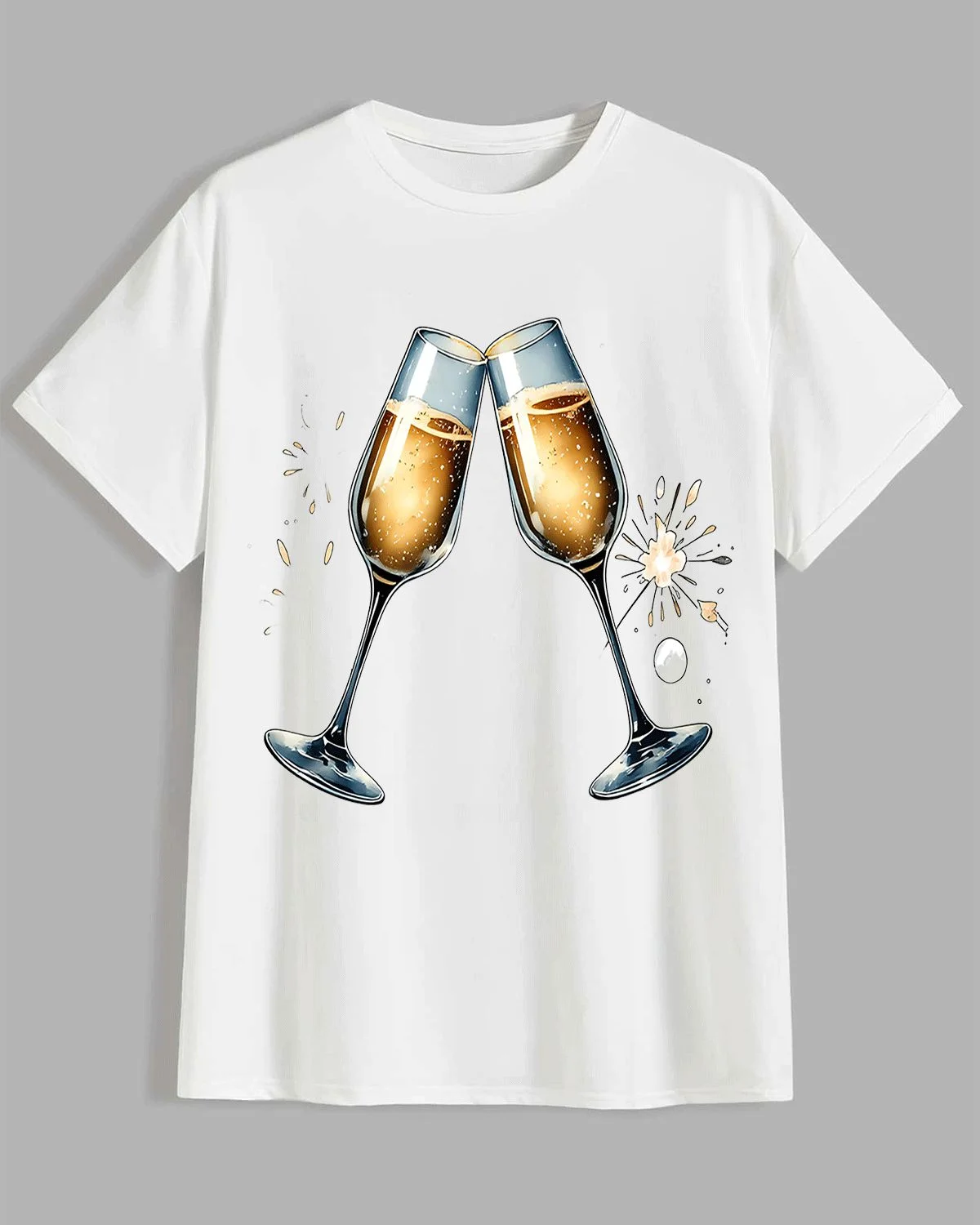New Year Champagne Toast with Sparkles Summer Cotton Graphic T Shirt - Classic Chic, Short Sleeve, Soft Fabric, Comfortable Fit