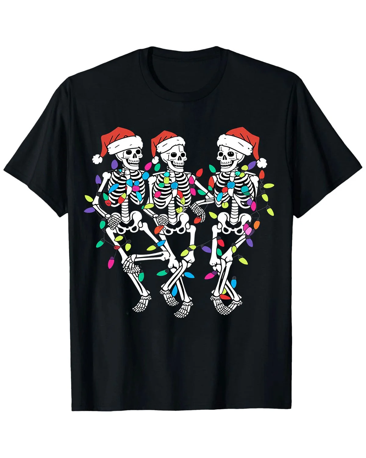 New Year Dancing Skeletons with Santa Hats and Lights Summer Cotton Graphic T Shirt - Funny Retro, Short Sleeve, Soft Fabric, Comfortable Fit